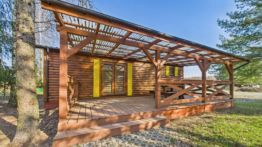 Konstrukcja stalowo-drewniana, dobudowane tarasy konstrukcji drewnianej. Wyposażone w energię elektryczną (ogrzewanie elektryczne), instalacja wod.-kan. W domkach znajduje się: