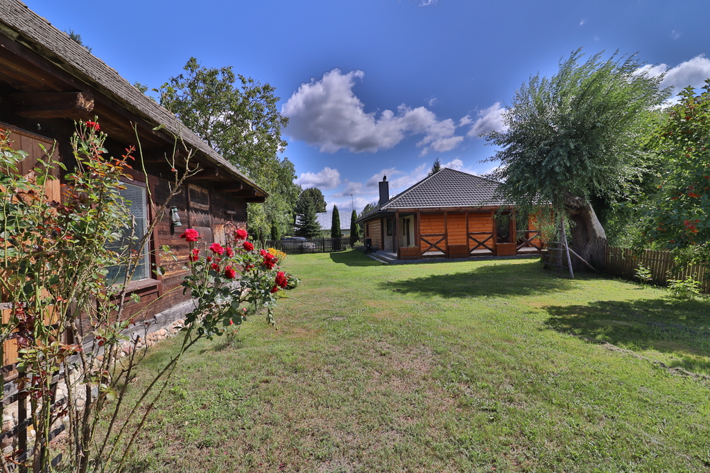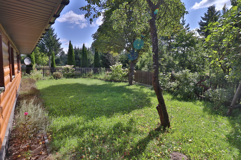 Zadaszony taras oraz piękny ogród ze stawem i dwoma starymi wierzbami zachęcają do relaksu na świeżym powietrzu. Na działce znajdują się także warzywnik, drzewa i krzewy owocowe oraz skalniaki z kwiatami.