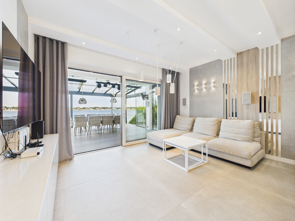 Dom jest w idealnym stanie, wykończony w wysokim standardzie, w pełni umeblowany i wyposażony, gotowy do zamieszkania. Posiada prywatną plaże oraz przystań na sprzęt wodny. Ogród zimowy wyposażony jest w elektryczne markizy, wysokiej jakości nagłośnienie zewnętrzne, oświetlenie oraz promienniki ciepła.