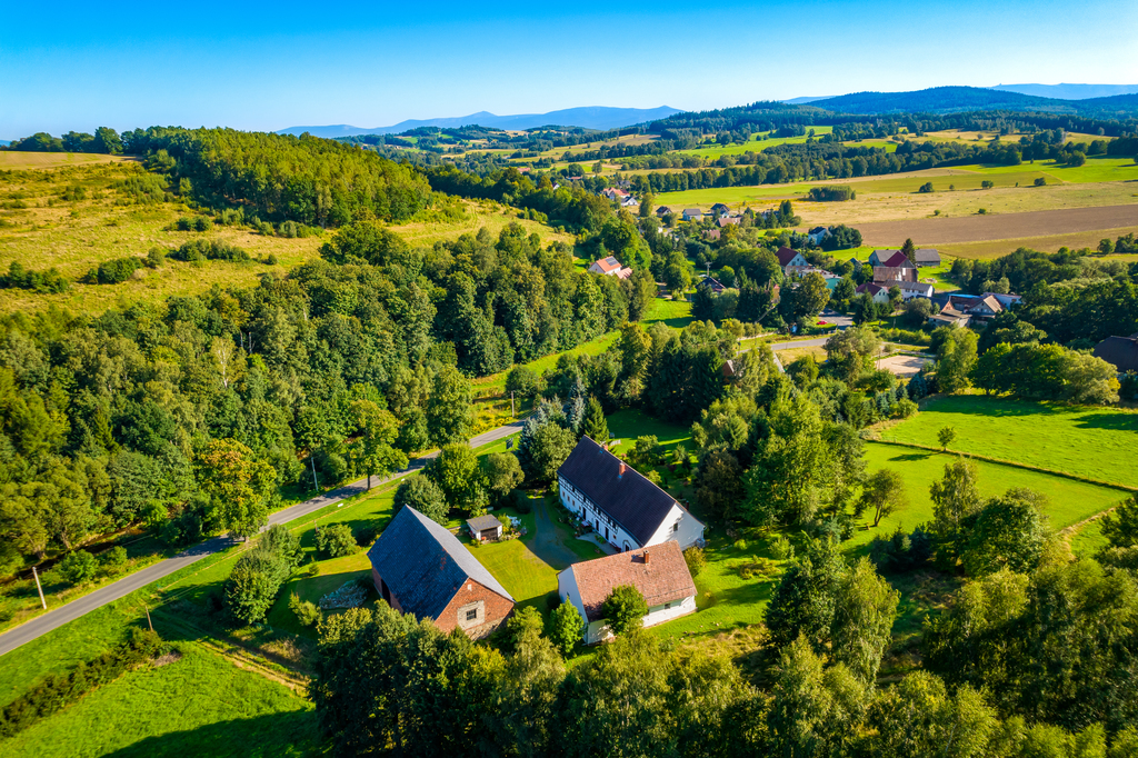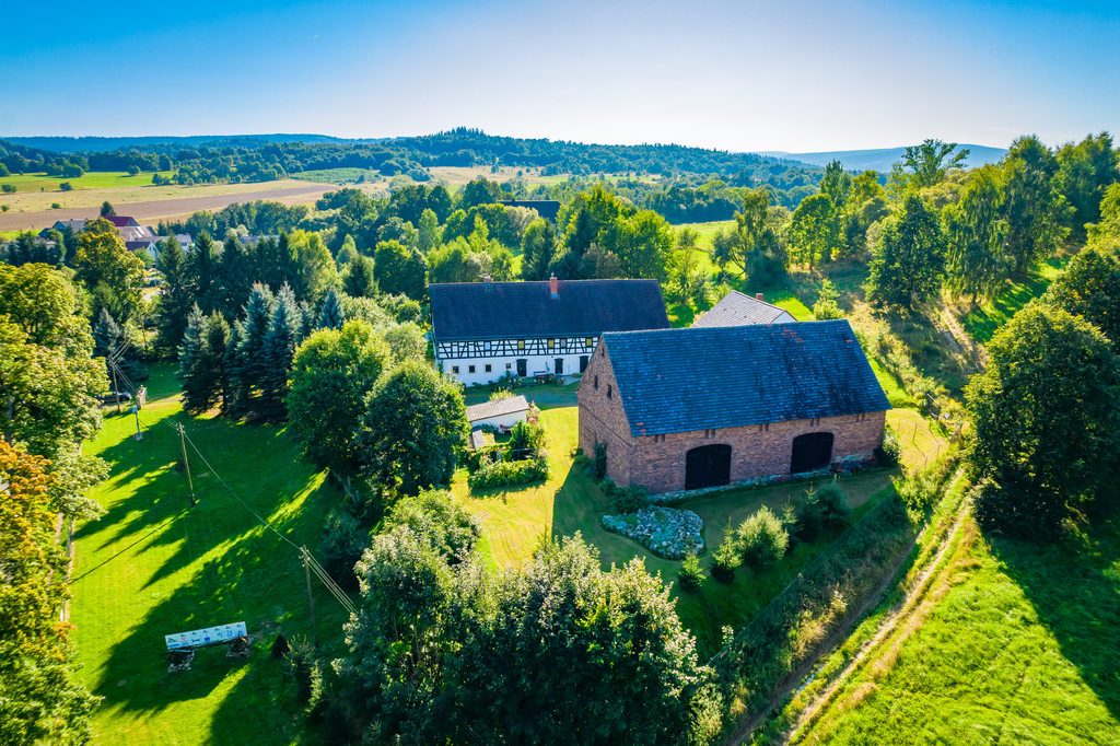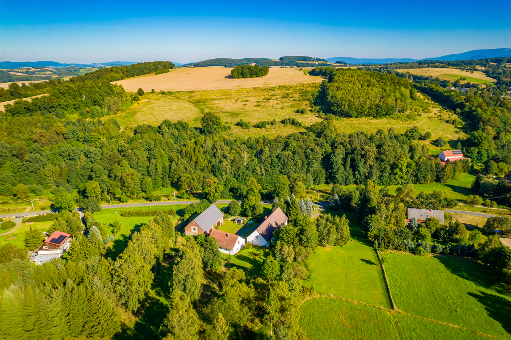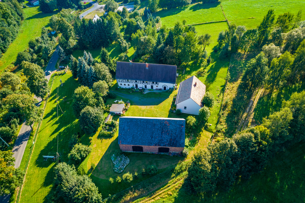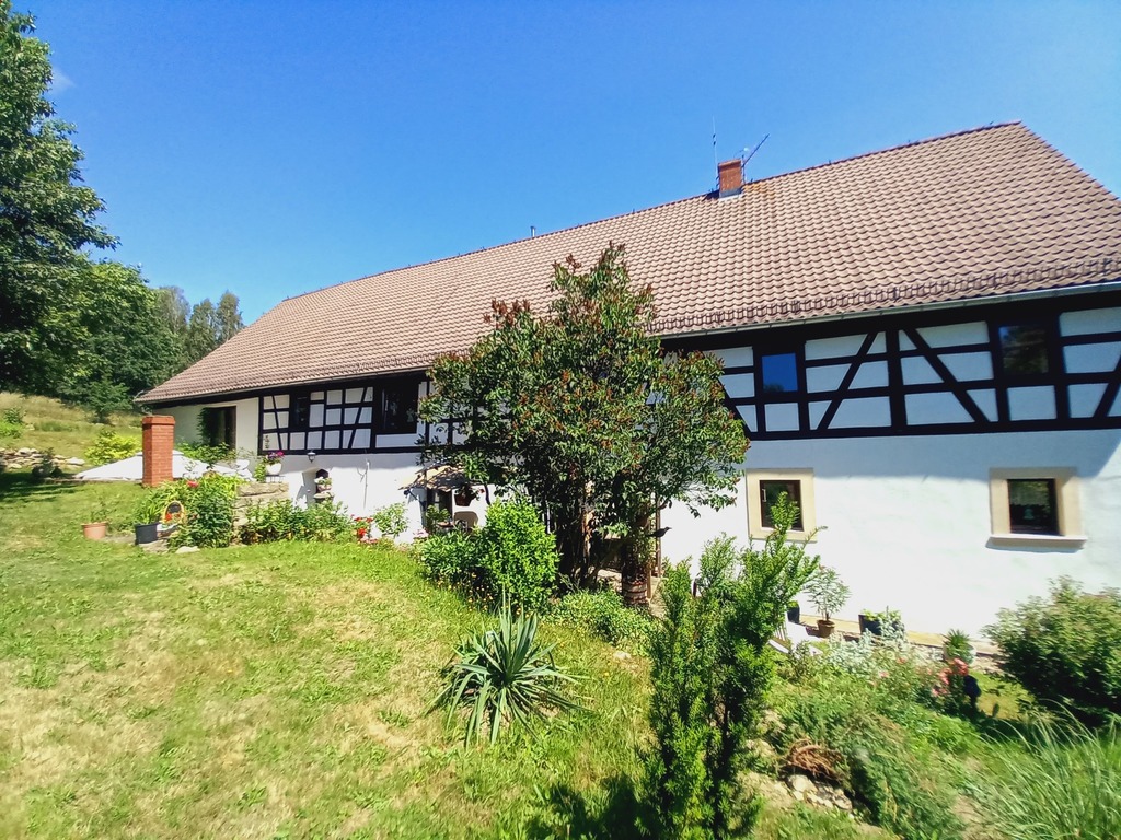 Prezentowana posiadłość to klimatyczne miejsce z ponad 200 letnią historią znajduje się na hektarowej działce i nie ma zbyt wielu sąsiadów. Cała posiadłość położona jest na wzniesieniu co jest jej niewątpliwym atutem, gdyż z góry możemy obserwować nie tylko naturę, kontemplować ciszę i świergot ptaków ale i zobaczymy ze wzgórza Karkonosze i królową Śnieżkę.