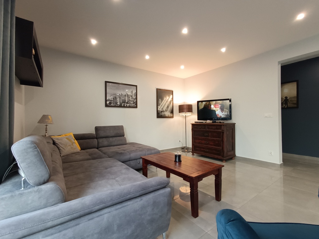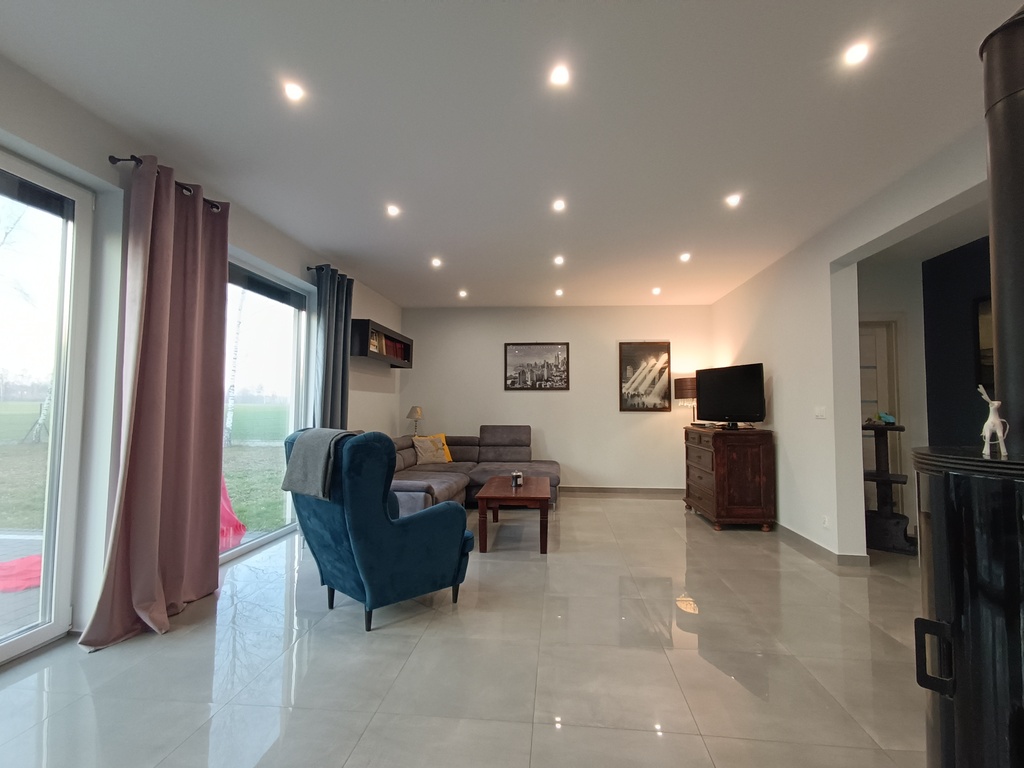 - Dużego salony z kominkiem, z wyjściem na taras (na wyposażeniu pozostaje narożnik oraz fotel)