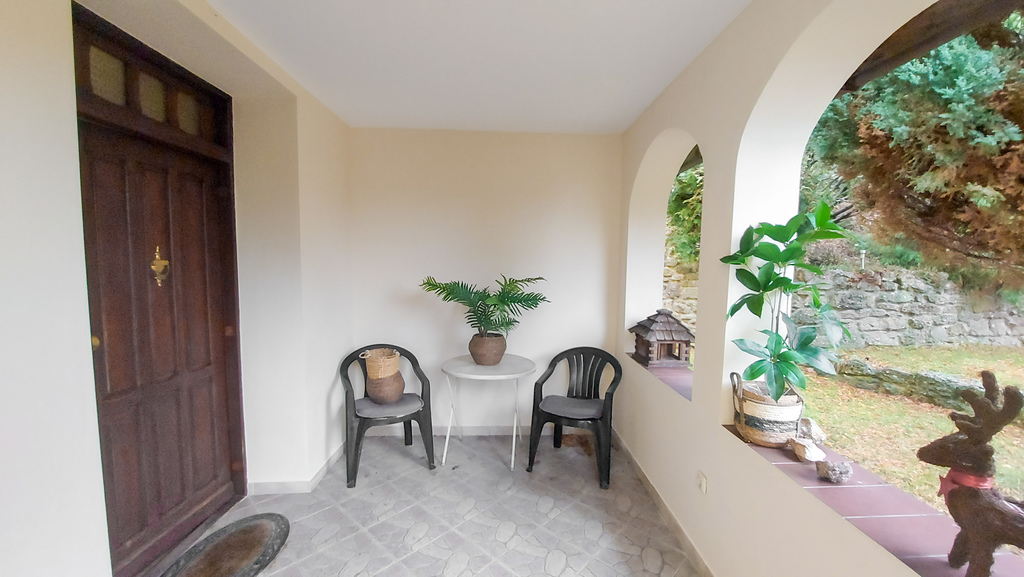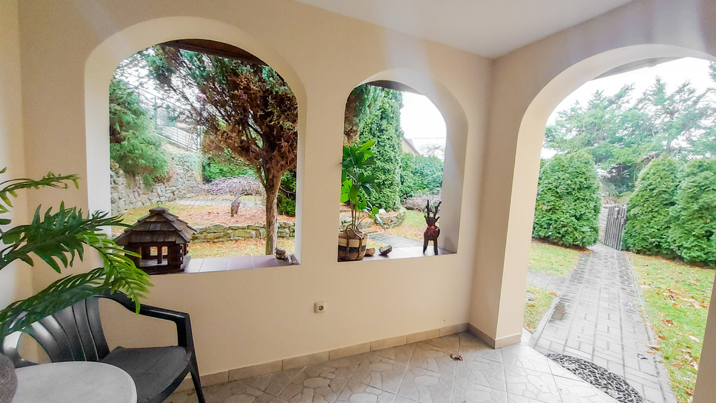 Okna z ekspozycją na wszystkie strony świata, dom posadowiony na działce o sporym nachyleniu dlatego możemy podziwiać kaskadowy ogród z którego rozpościera się piękny widok na miejscowość i okalające góry.