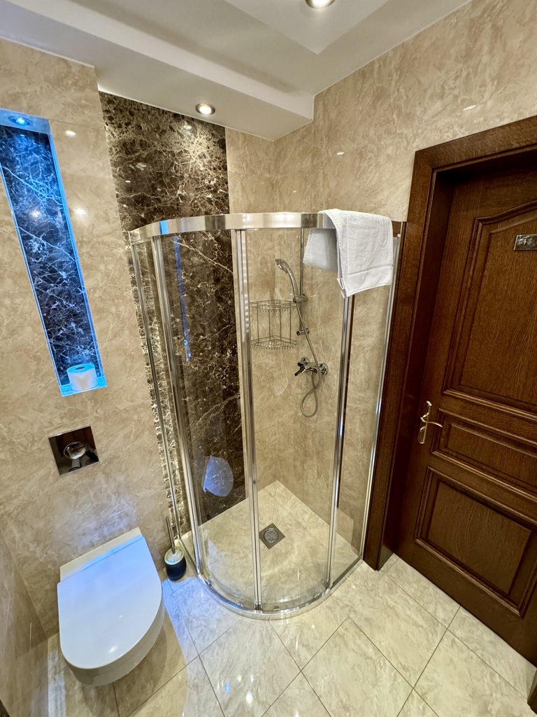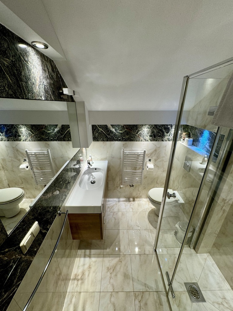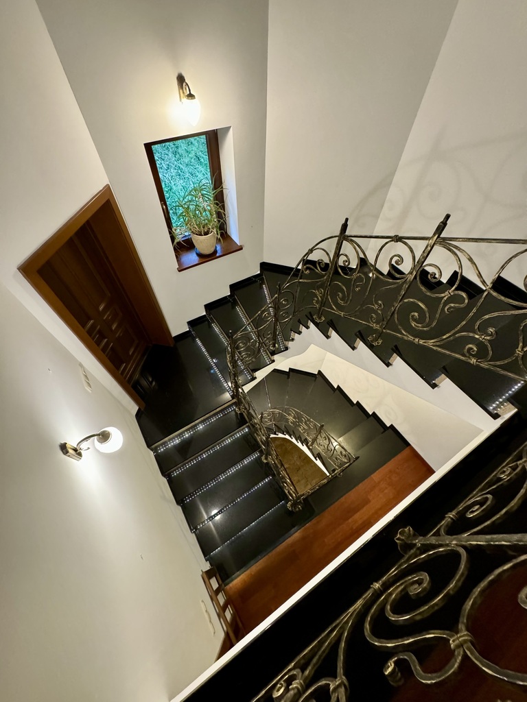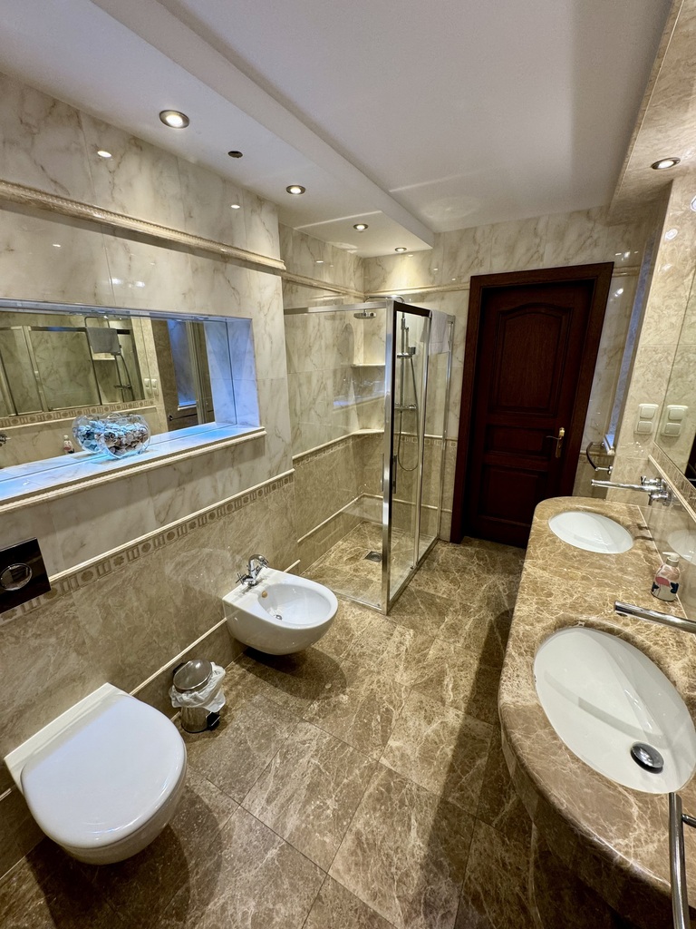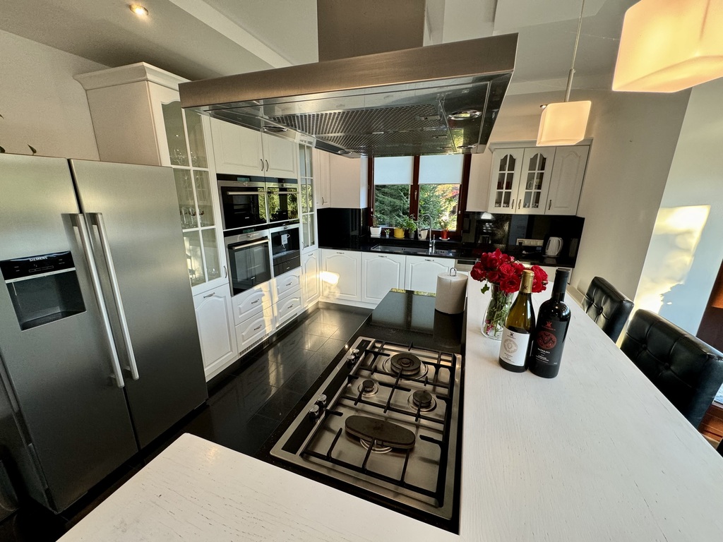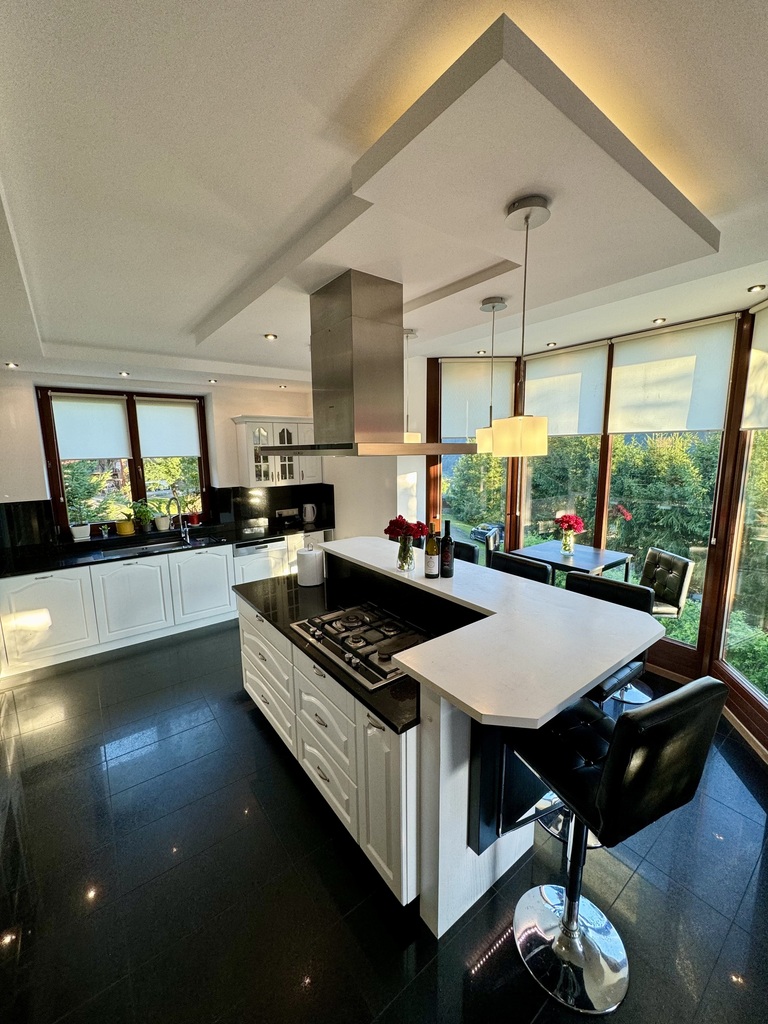 Do wykończenia wykorzystano wysokiej jakości materiały, w tym naturalny granit oraz eleganckie parkiety, co nadaje wnętrzom prestiżowy charakter.