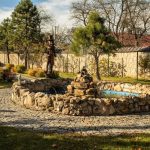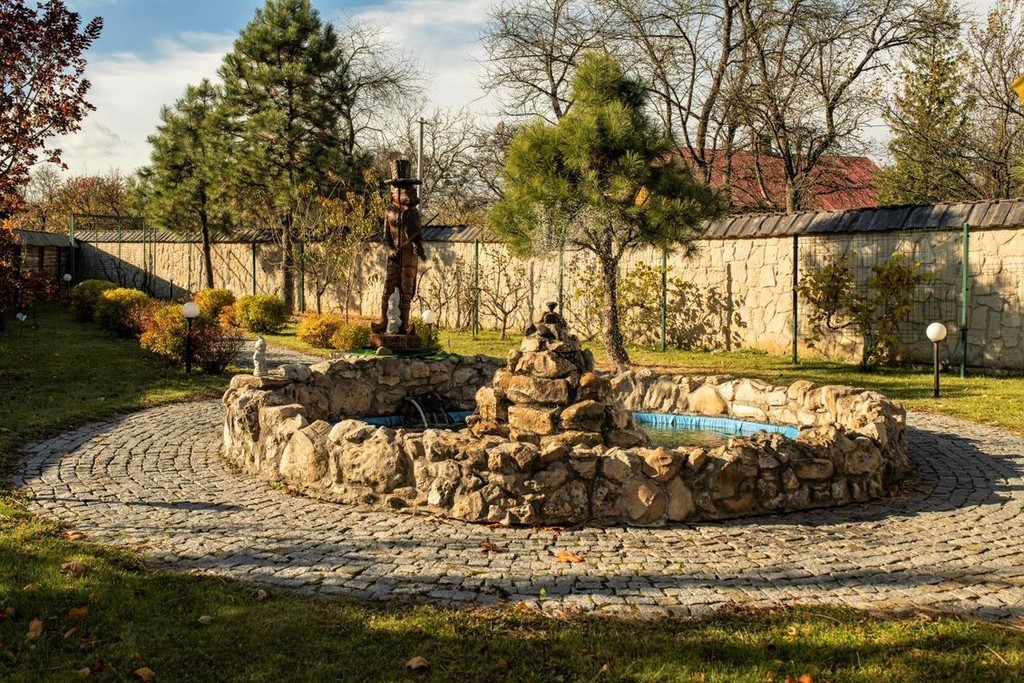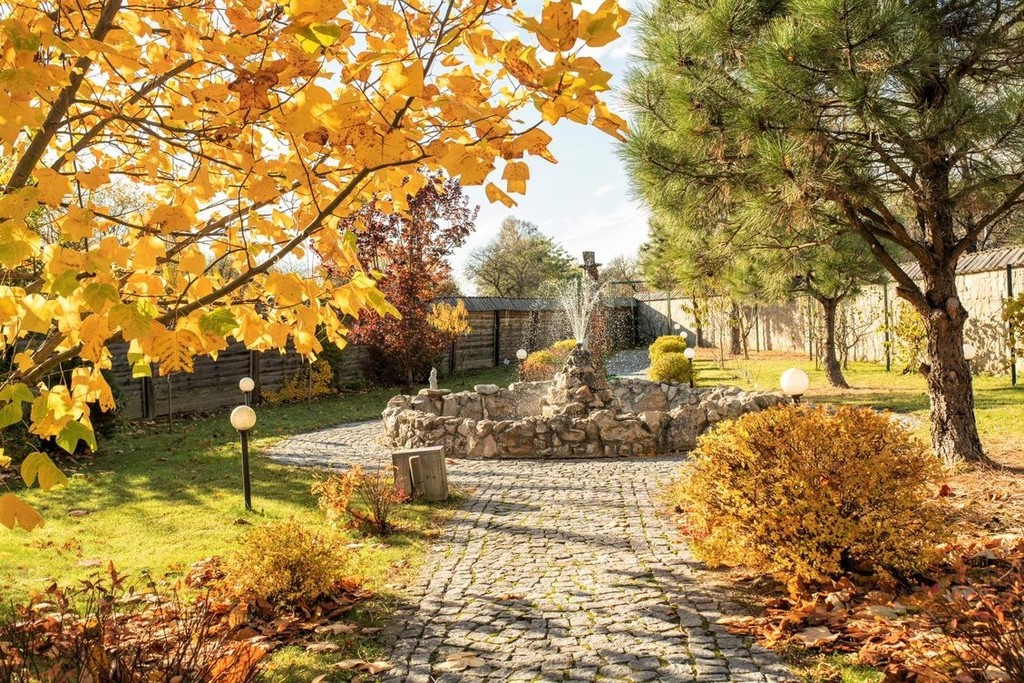 Duże oczko wodne z fontanną, zamieszkałe przez około 40 karpi Koi.