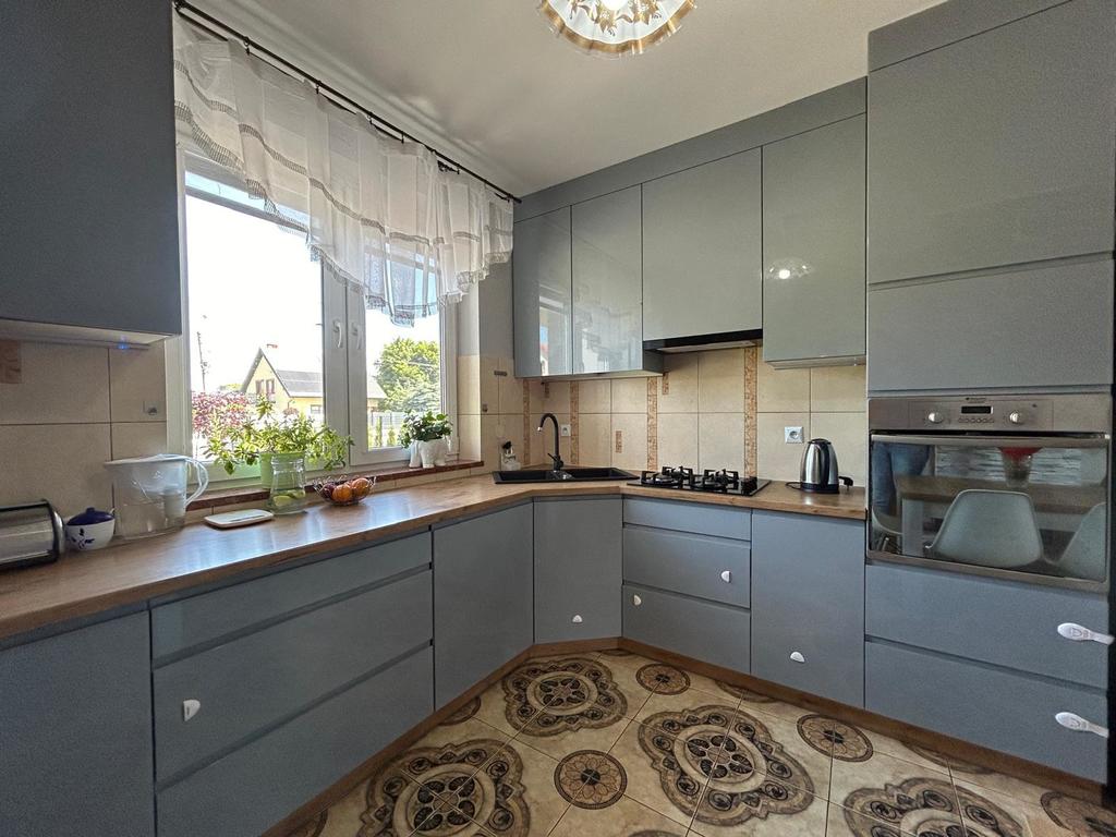 * Kuchnia jest w pełni umeblowana i otwarta, co sprzyja wspólnemu spędzaniu czasu. Przestrzeń między kuchnią i salonem daje możliwość wydzielenia jadalni.