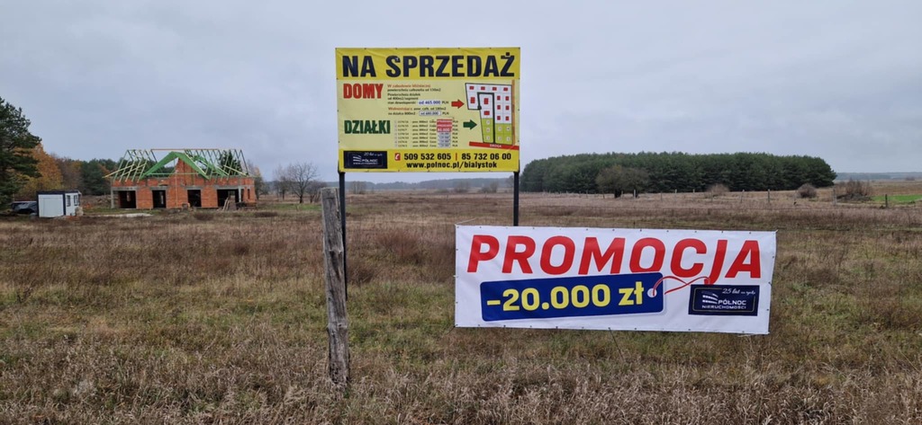 Cena m2 domu tylko ok. 2657 PLN/m2 ! (wraz z działką) Lokalizacja: droga na Kiermusy (jeszcze przed znakiem Tykocin) Od strony południowej szosa asfaltowa (powiatowa), od strony wschodniej droga gruntowa (gminna). Media: prąd, woda w trakcie realizacji Przykładowe odległości: Białystok ok. 30km Warszawa ok. 180km Działki są idealne skomunikowane przez bliskość trasy S8 tylko 10km oraz trasy 64 ok. 8km (trasa na Łomżę). Tykocin posiada pełną infrastrukturę do mieszkania/życia: Przychodnia, Apteka, Żłobek, Przedszkole, Szkoła, Straż Pożarna, Policja, Poczta Polska, Biedronka, Dino, Market Budowlany, klub piłkarski Hetman Tykocin oraz pełna baza turystyczna w tym restauracje i bary.