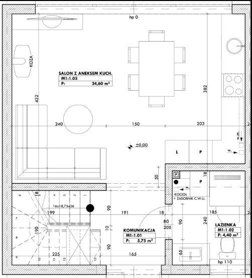- Parter: salon z kuchnią, łazienka, pomieszczenie gospodarcze