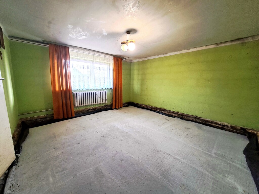 - wymaga remontu, częściowo został wykonany chudy beton, na parterze zostały zamontowane plastikowe okna ponieważ był zamieszkały