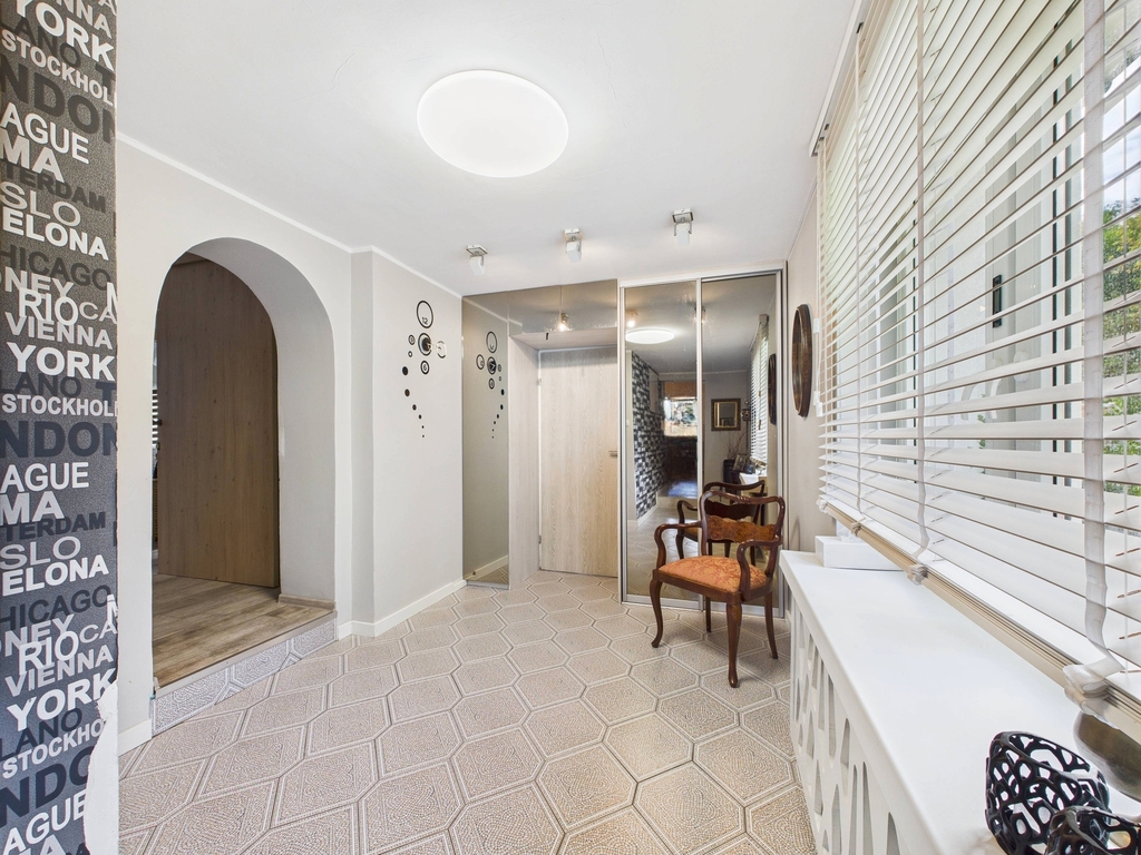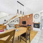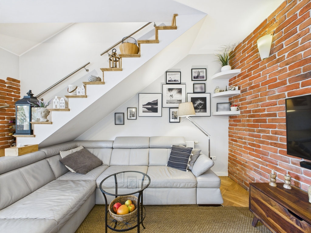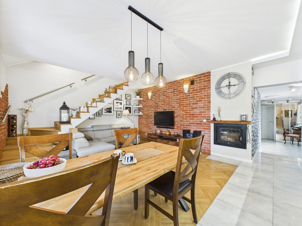 - Drewniane wykończenia – eleganckie schody i parkiet dębowy,