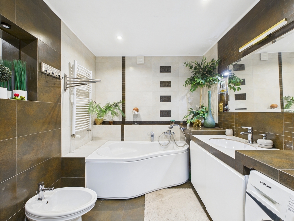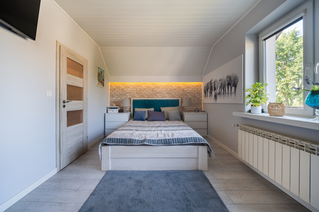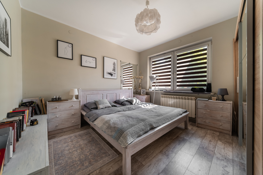 Poddasze (1): - sypialnia główna (16 m²) z własną łazienką (5,6 m²) i klimatyzacją,