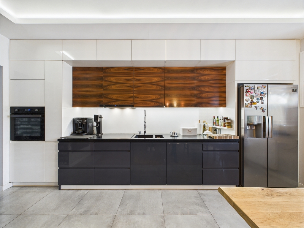 - nowoczesna kuchnia z zabudową na wymiar w odcieniach grafitu, bieli i drewna – blat oraz zlew ze staronu (trwały konglomerat),