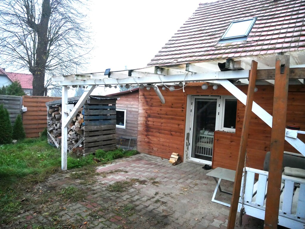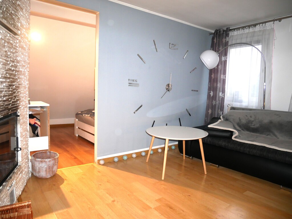 - salon z aneksem kuchennym i kominkiem. Z salonu wyjście na ogród.