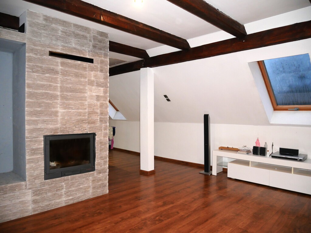 - przestronny pokój zajmujący całą powierzchnię poddasza plus drugi kominek.