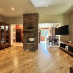 Dom główny (150 m²) – przytulna rodzinna przestrzeń: • Salon z kominkiem i widokiem na jezioro