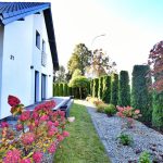 Dom usytułowany na skraju działki pozwolił na zagospodarowanie działki w sposób który optycznie powiększa cały teren.