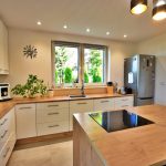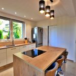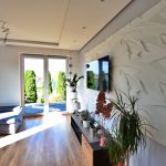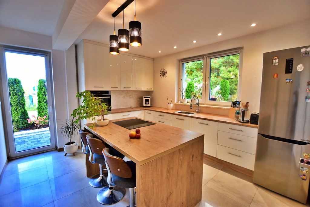 - Między kuchnią a salonem zastosowana ściana, która pozwala na połączenie tych dwóch pomieszczeń tworząc salon z aneksem kuchennym.