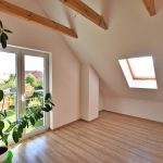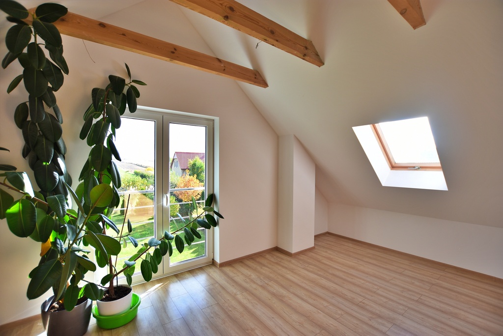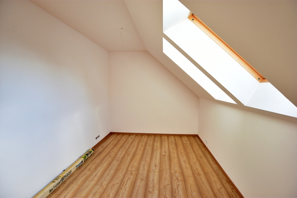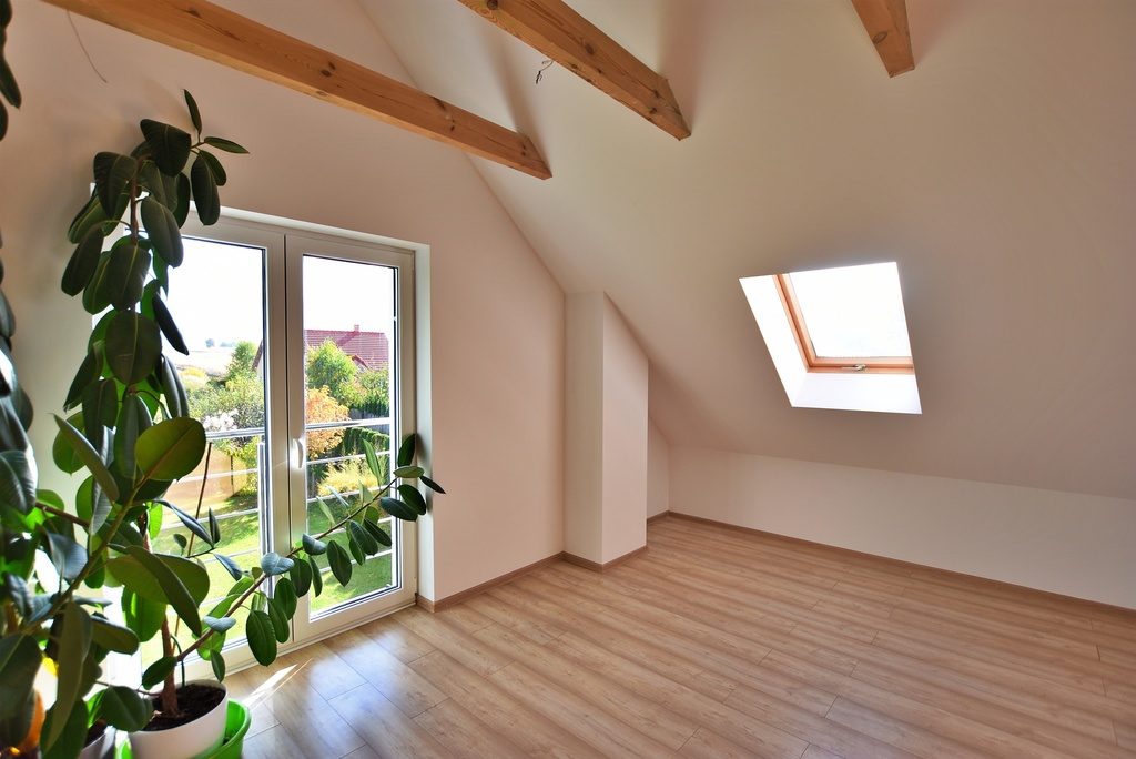 - Strop drewniany, dach ocieplony wełną o grubości 15 cm.