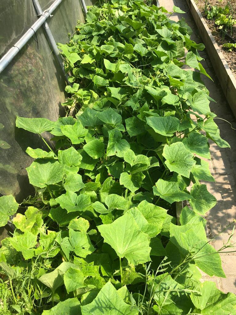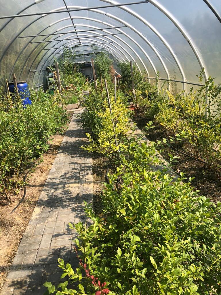 Duży namiot szklarniowy pod którym uprawiane są truskawki, jagody, pomidory, ogórki, brzoskwinie itd.