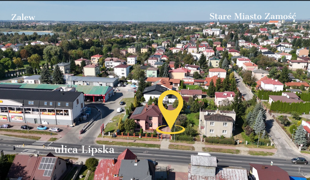 Dom wolnostojący, położony przy w centrum Zamościa, z bezpośrednim zjazdem z ulicy Lipskiej. Na parterze budynku, z osobnym wejściem od ulicy, znajdują się pomieszczenia w których można stworzyć swoje miejsce pracy. Bardzo dobra lokalizacja, przy głównej drodze wyjazdowej z miasta w kierunku Krasnobrodu, gwarantuje dużą rozpoznawalność prowadzonej tu działalności.