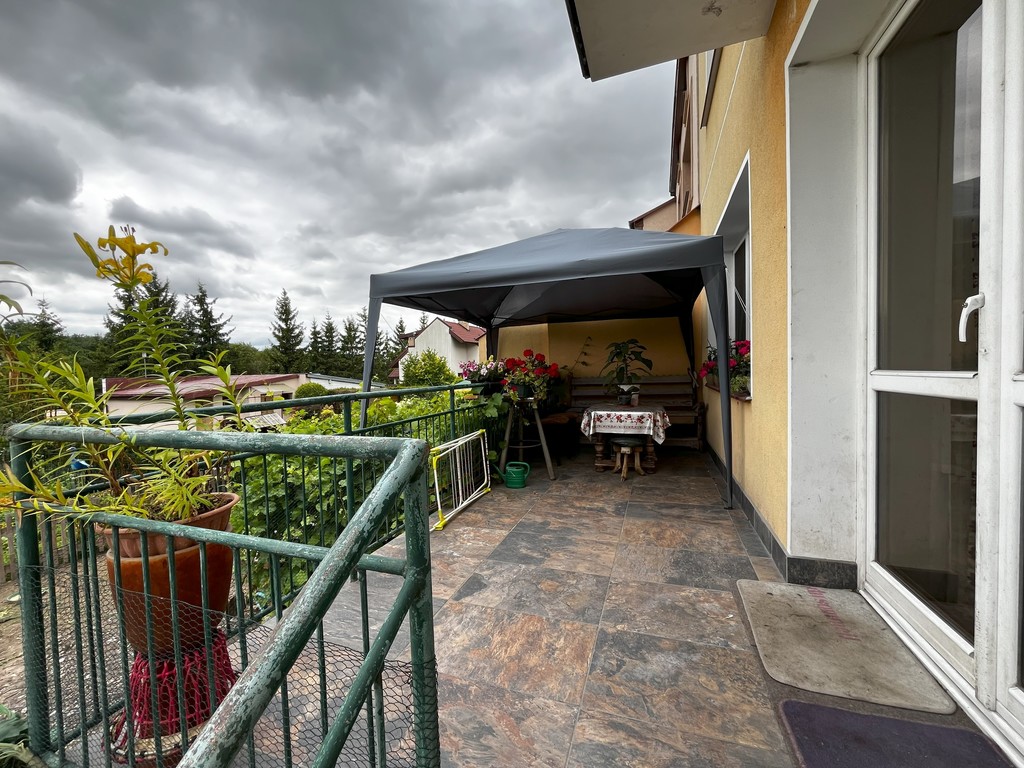 * duży tras z wyjściem z salonu i balkon na piętrze