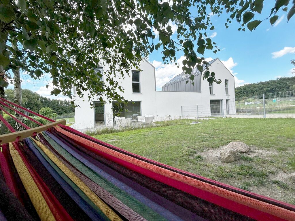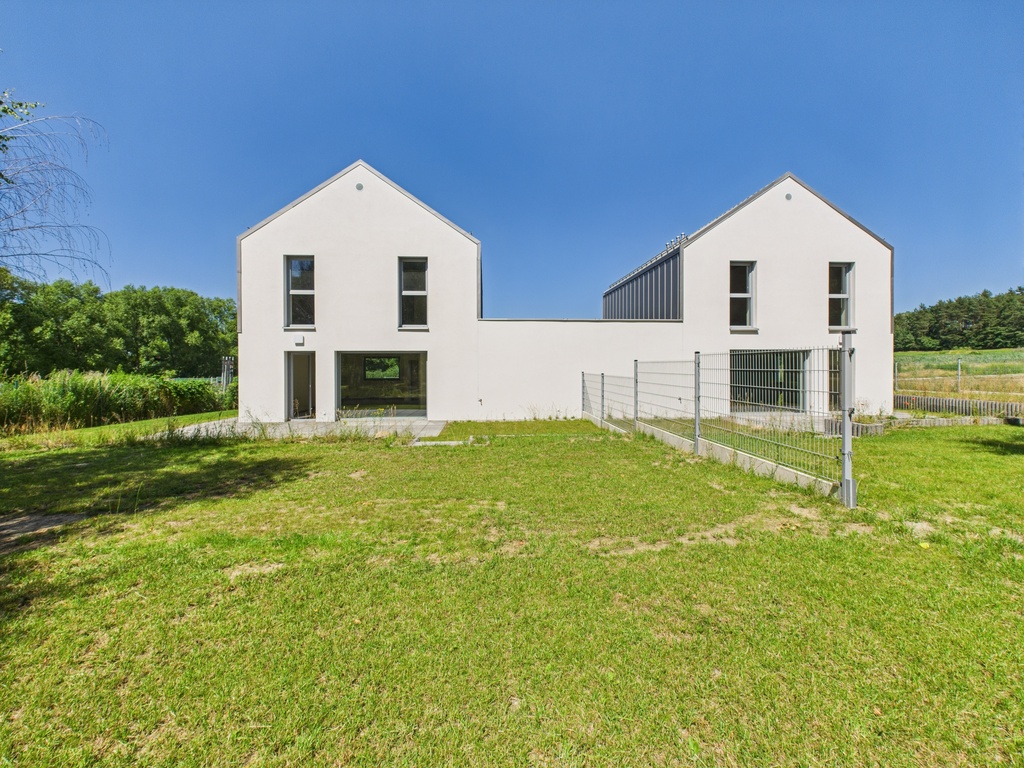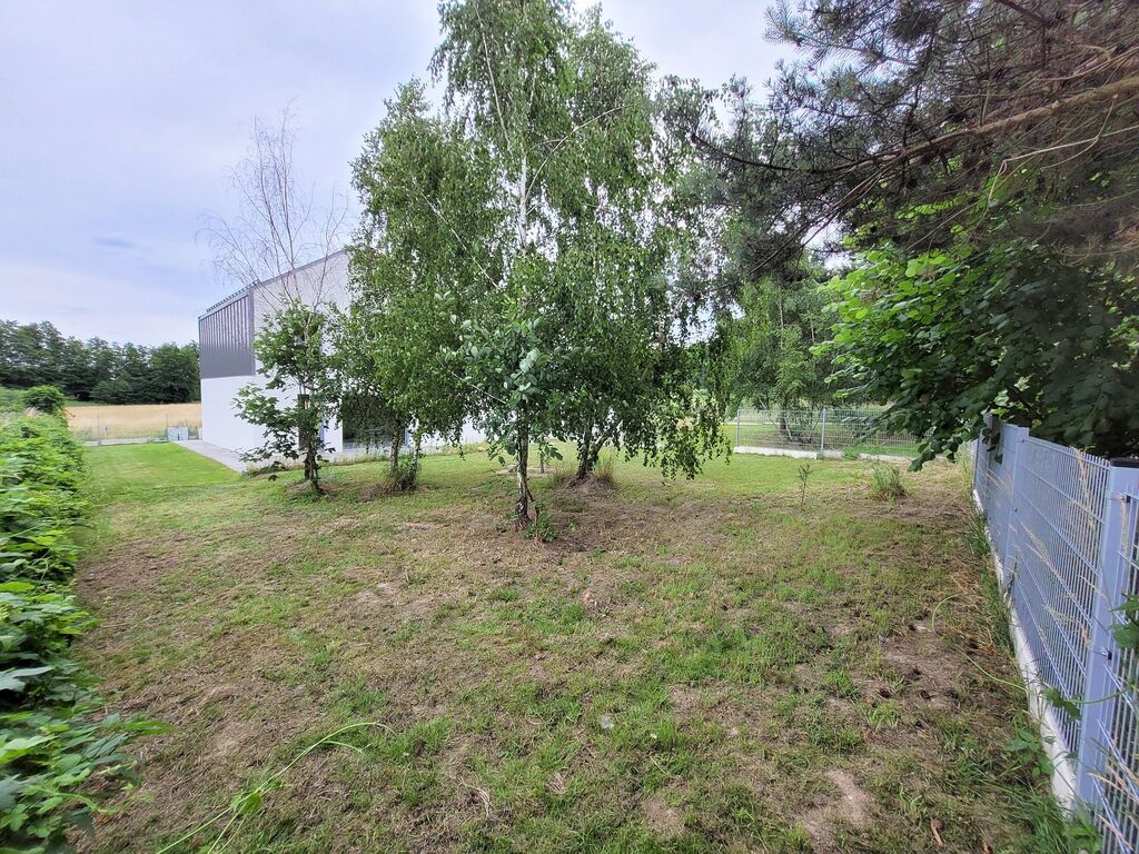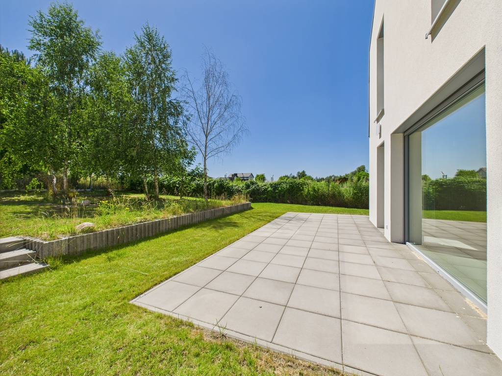 Dzięki przeszło 5,5 arowej działce, dom posiada spory ogród z drzewami i potencjałem do dalszej aranżacji przydomowej zieleni.