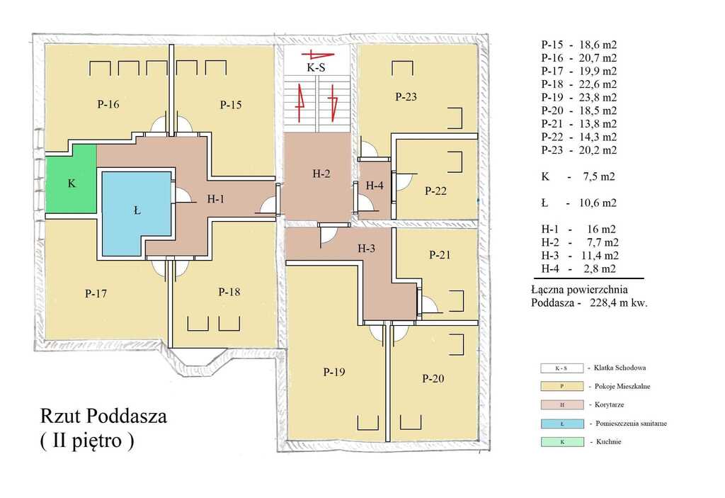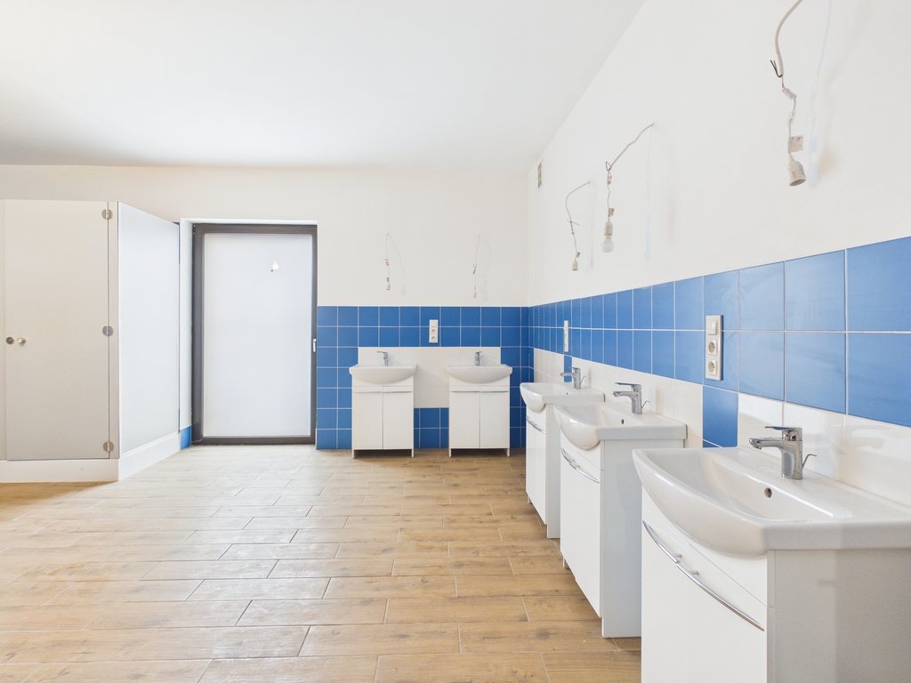 • 3 kondygnacje: 23 pokoje, aneksy kuchenne, 15 toalet, 15 natrysków, 15 umywalek oraz dodatkowe pomieszczenia socjalno-gospodarcze,