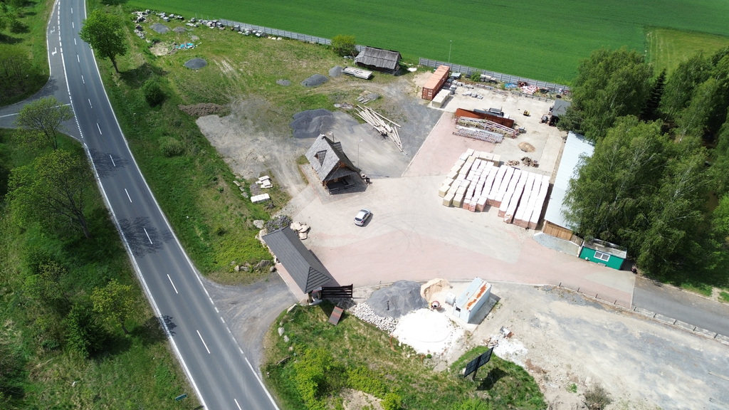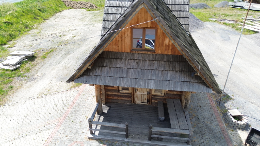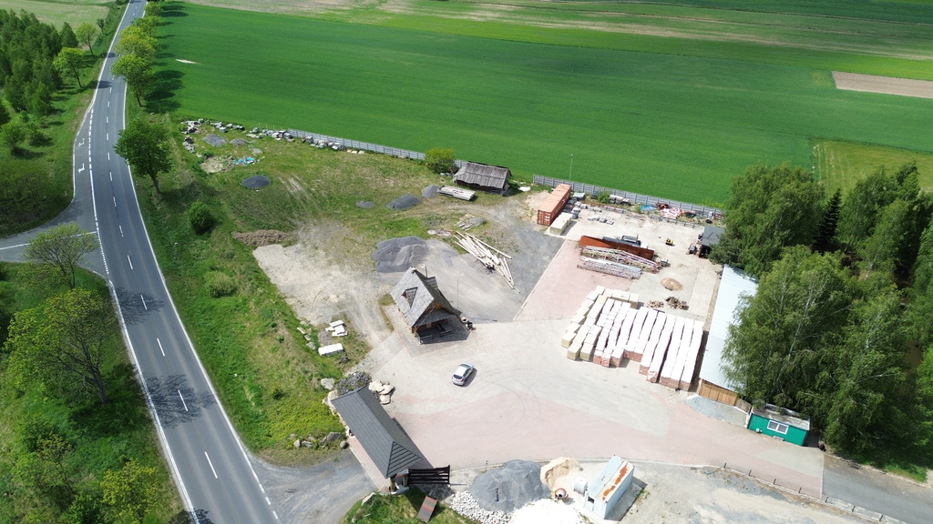 - Na działce znajdują się dwa drewniane domki w stylu góralskim, które doskonale sprawdzą się jako biura firmy, pomieszczenia socjalne lub miejsce do spotkań z klientami