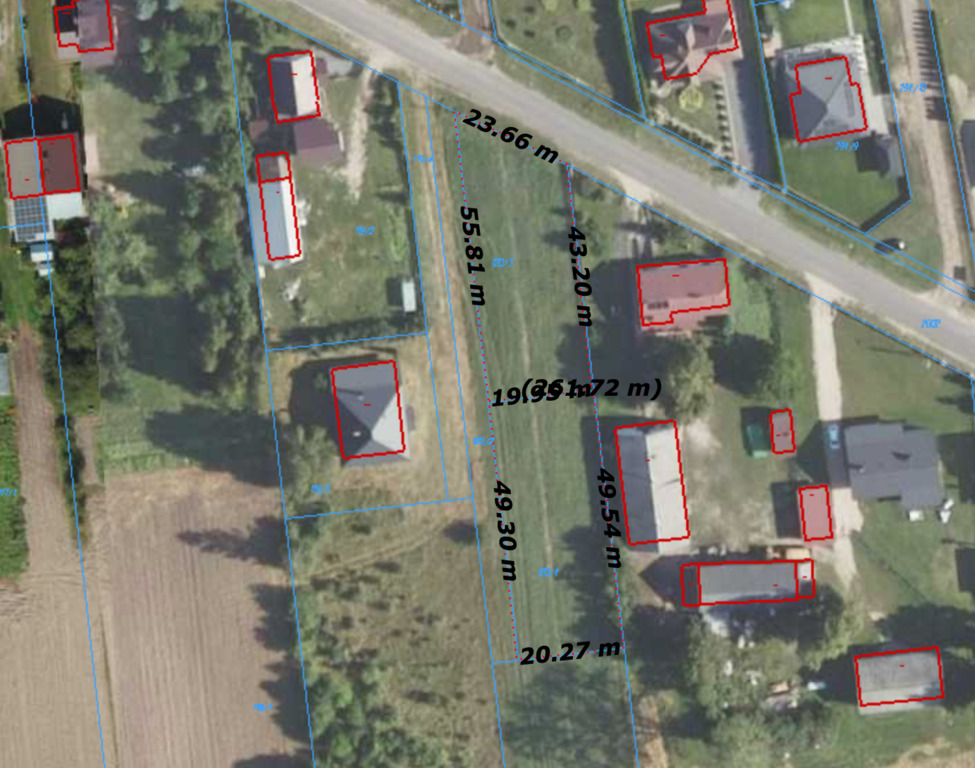 - Wymiary działki: szerokość ok. 20 m, długość ok. 49 m