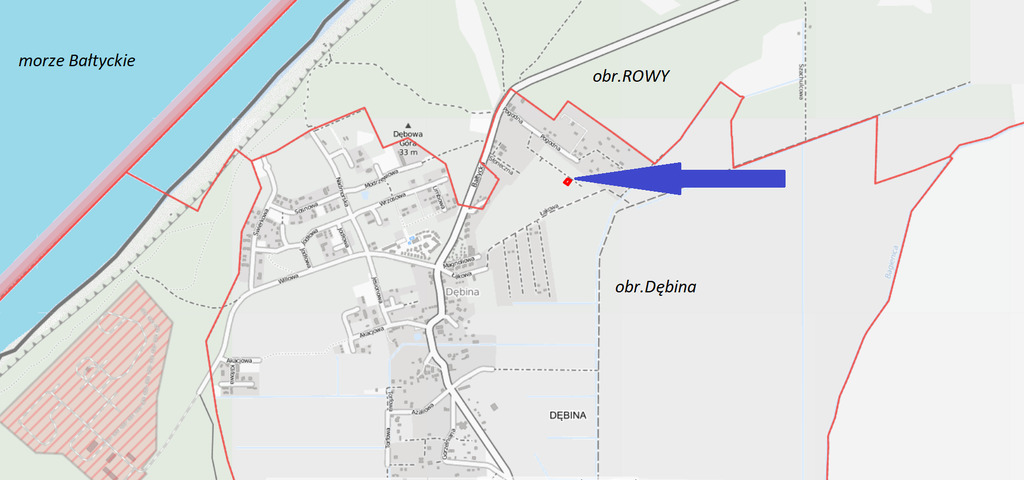 Dębina w gminie Ustka. Nieruchomość gruntowa o numerze ewidencyjnym 667 oraz powierzchni 260 m2 , położona w kompleksie działek blisko obrębu geodezyjnego Rowy.