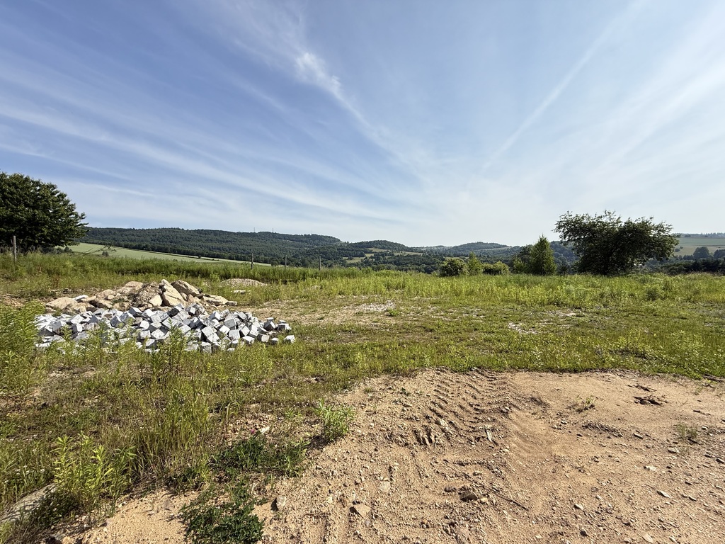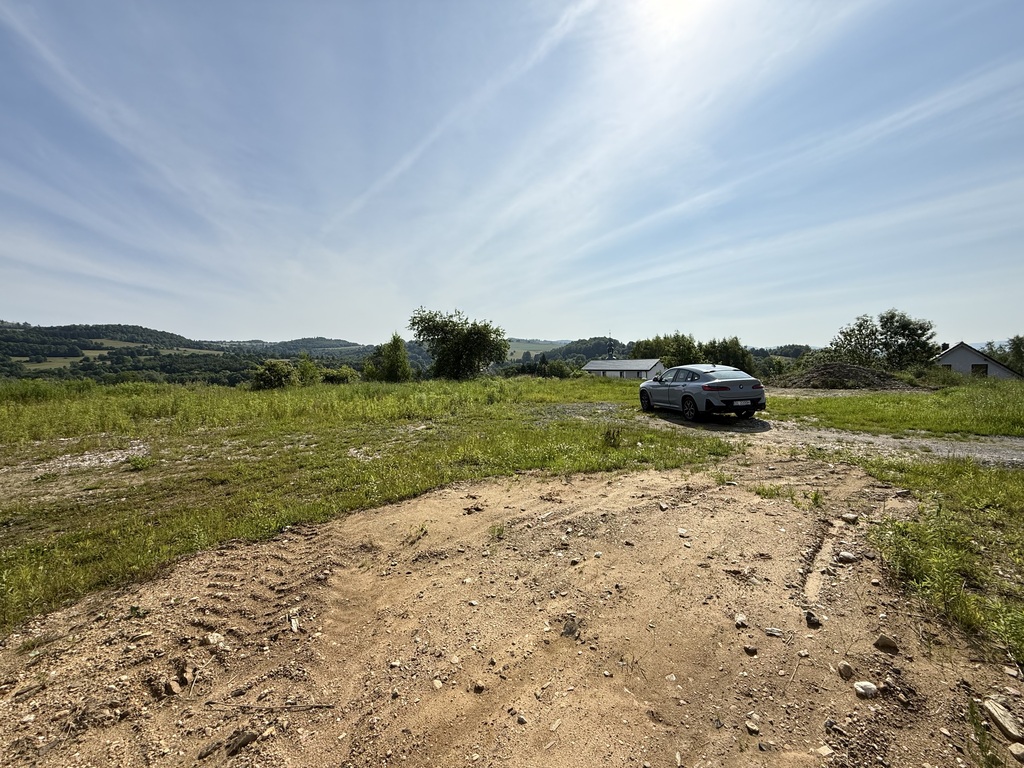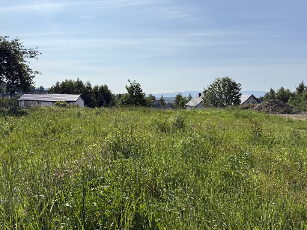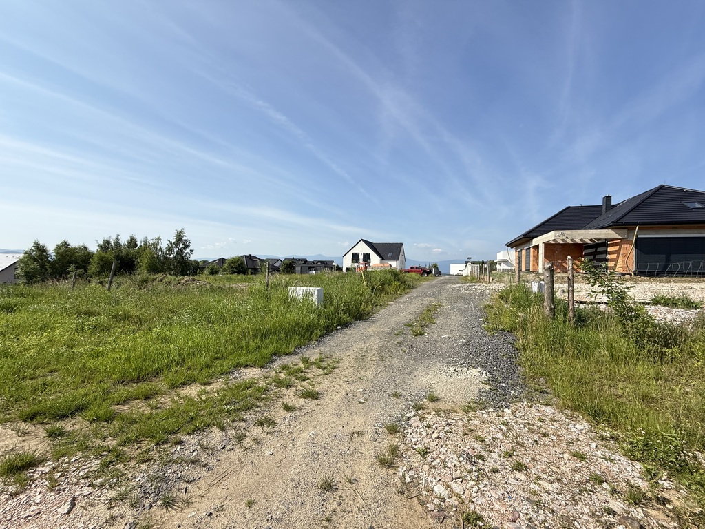 Lokalizacyjnie działka położna na końcu drogi więc od frontu mamy wjazd z niego widok na Karkonosze a za plecami Kaczawy i pola, domy w oddali.
