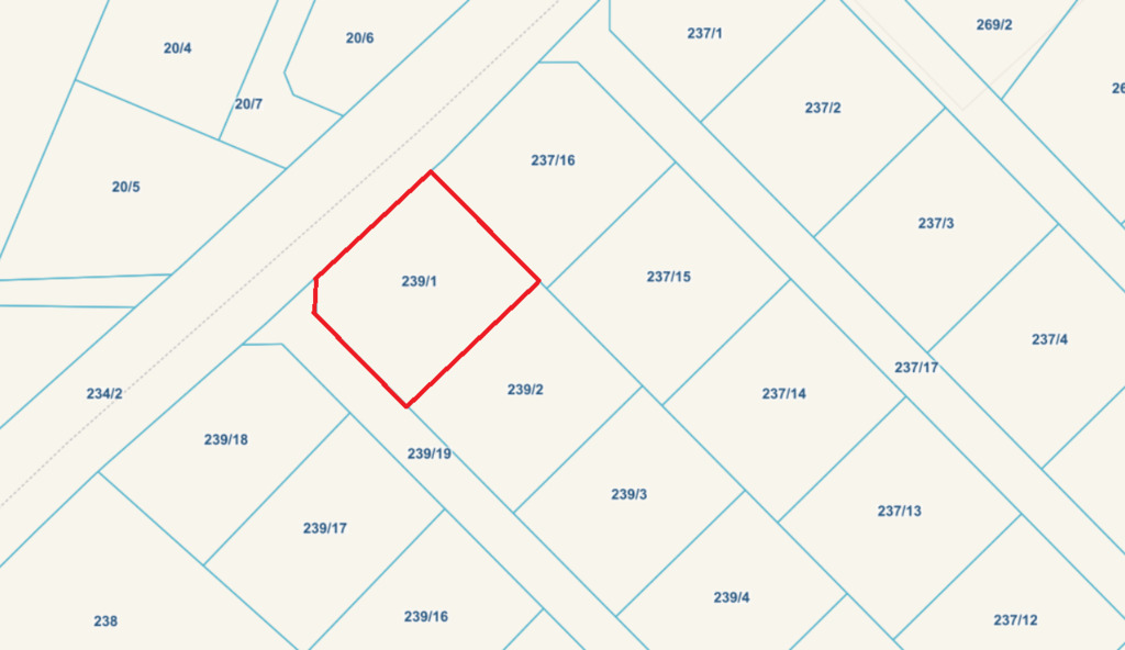 Oferowana działka ma numer ewidencyjny 239/1 i powierzchnię 869 m².