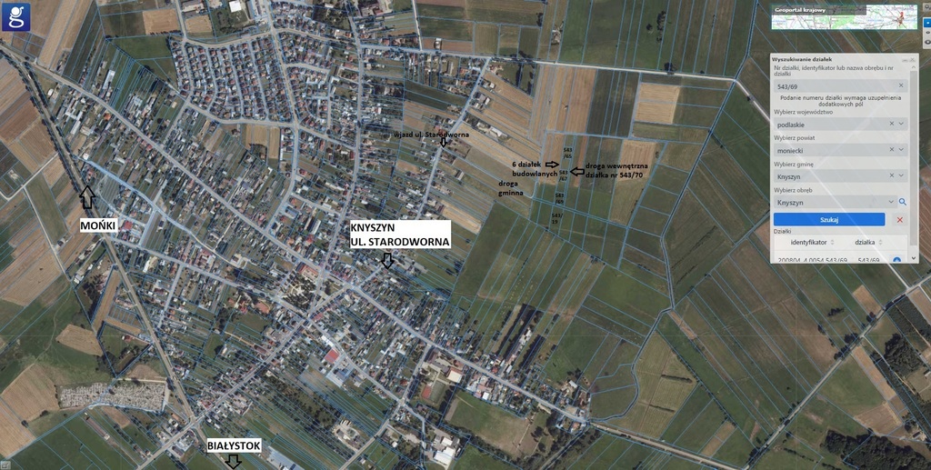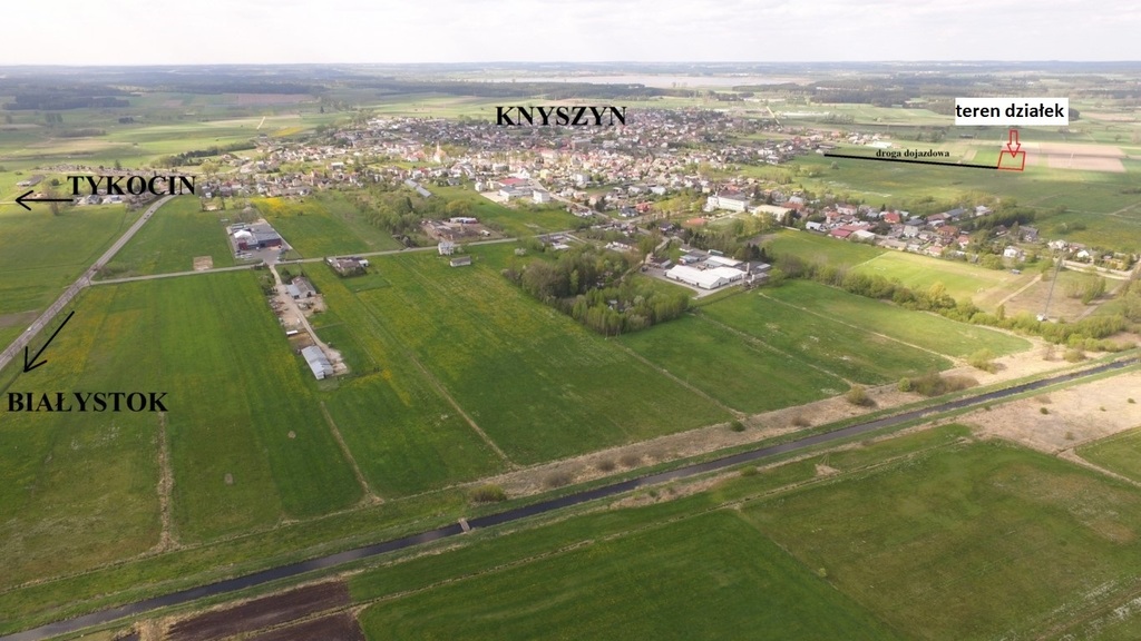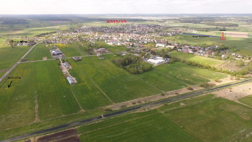 Działki znajduje się 350m od ul. Starodwornej w Knyszynie, dojazd szeroką 6m drogą gminną. Z działek rozpościera się piękny widok na okolicę Knyszyna.