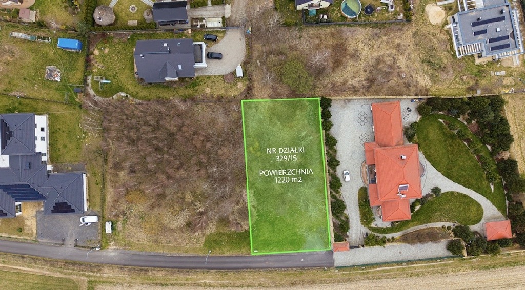 - Powierzchnia: 1220 m² (12,2 ara), w tym działka 1076 m² oraz udział w drodze prywatnej 144 m²