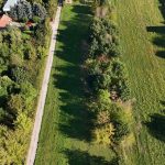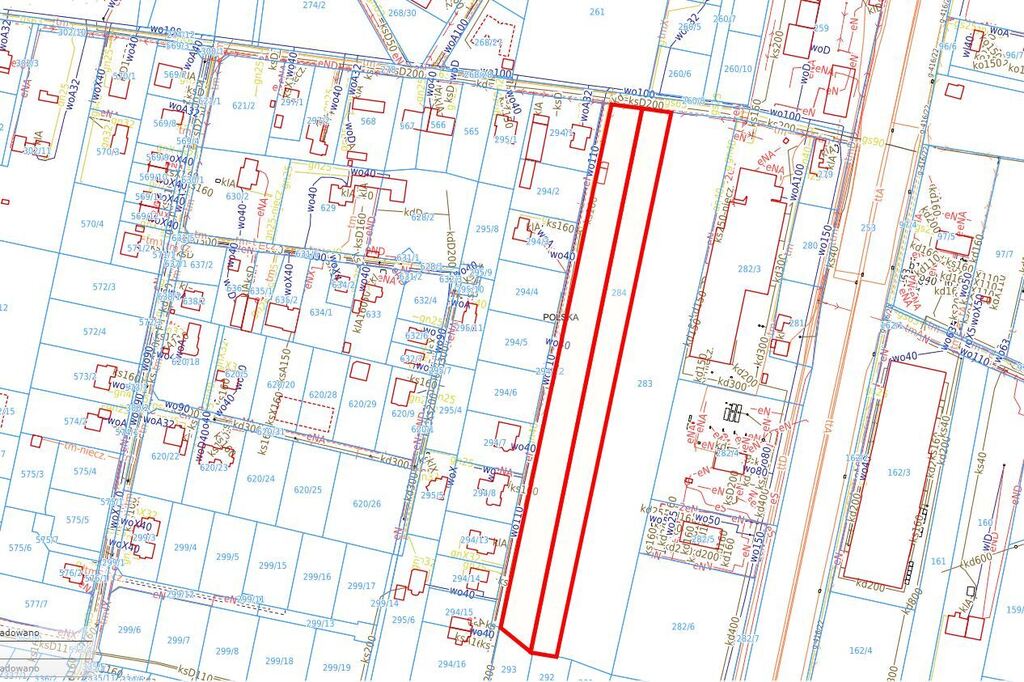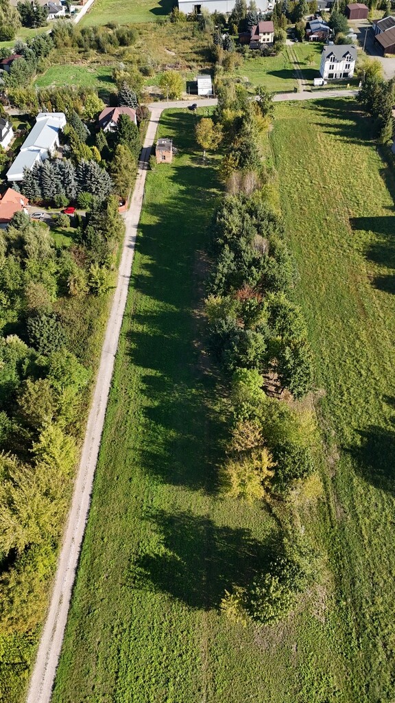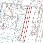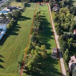 Działka budowlana o powierzchni 14 900 m2 w kształcie prostokąta o wymiarach 40 m x 365 m z płaskim ukształtowaniem terenu.