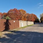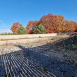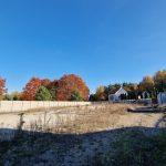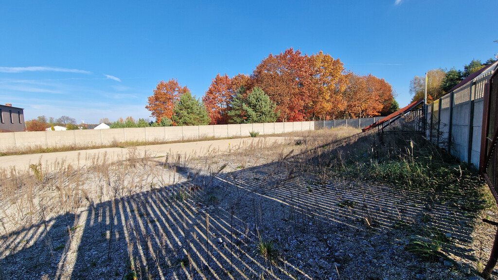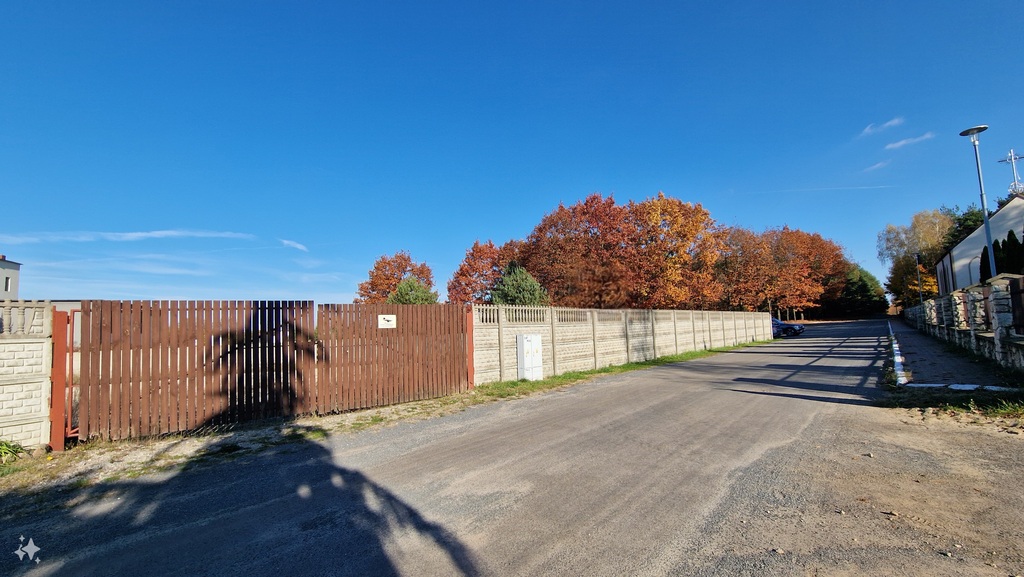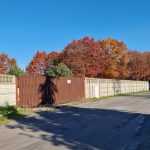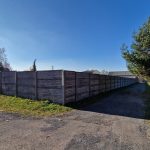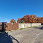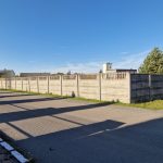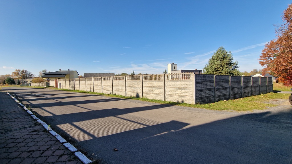 Działka ogrodzona w całości betonowym płotem. z szeroką brama wjazdową.