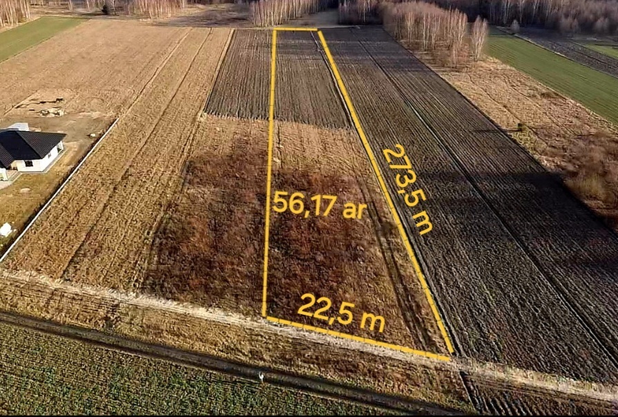 Działka ma powierzchnię 56 arów, ma kształt prostokąta a teren jest ukształtowany płasko.