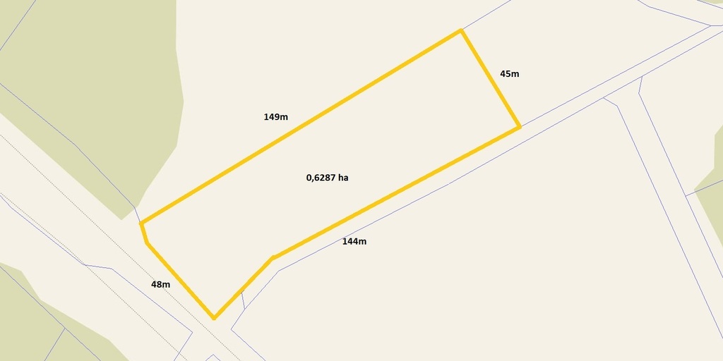 Działka jest płaska i ma kształt zbliżony do prostokąta o szerokości 45 m i długości 149 m.
