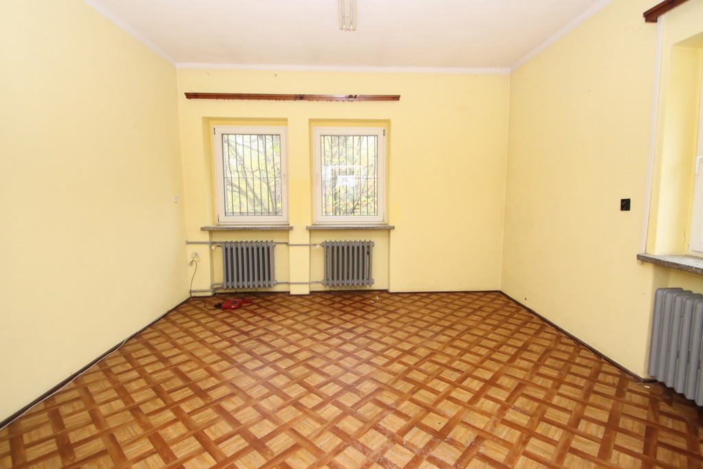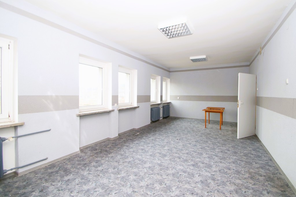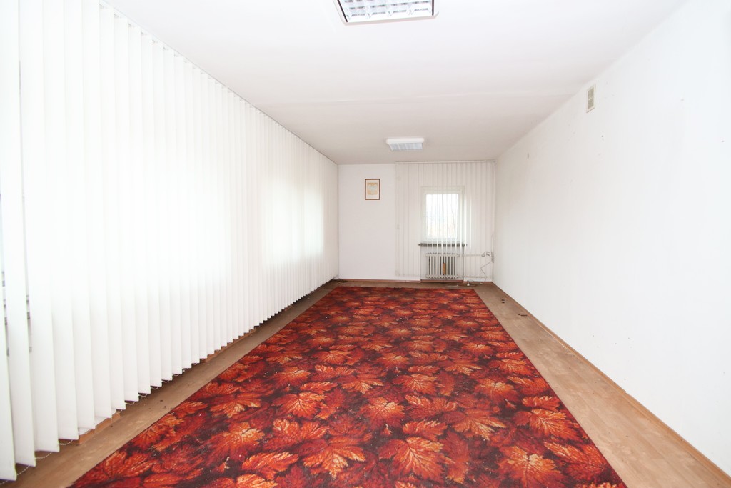 Budynek biurowy dwukondygnacyjny, podpiwniczony, docieplony, dach pokryty papą, okna pcv, drzwi wejściowe przeszklone, stan obiektu do odświeżenia bądź remontu.
