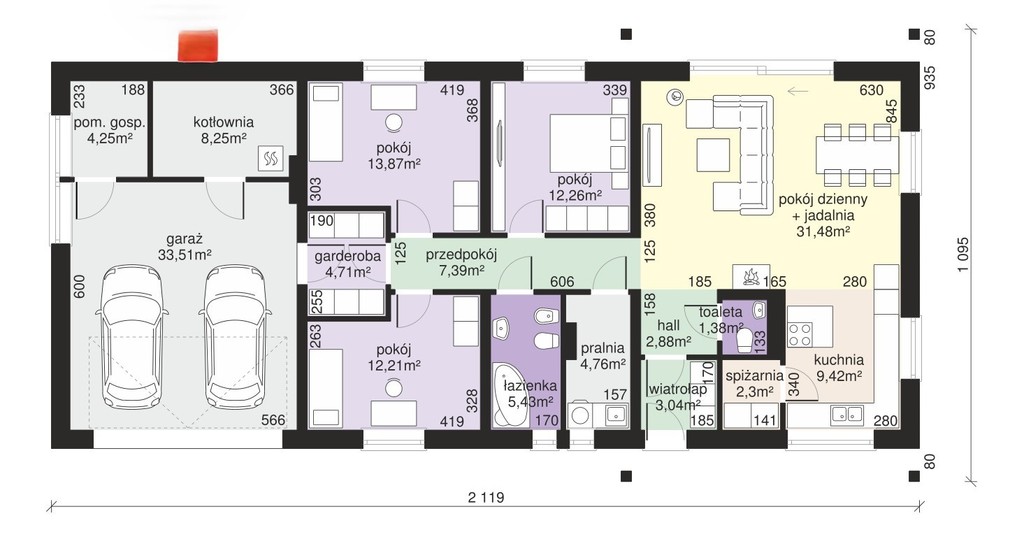 W projekcie dokonano zmiany polegające na podniesieniu kalenicy w stosunku do pierwowzoru, co umożliwia wykorzystanie poddasza na cele mieszkaniowe lub jako strych o dodatkowej powierzchni 143 m2 mierzonych po podłodze.