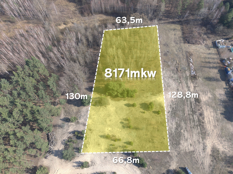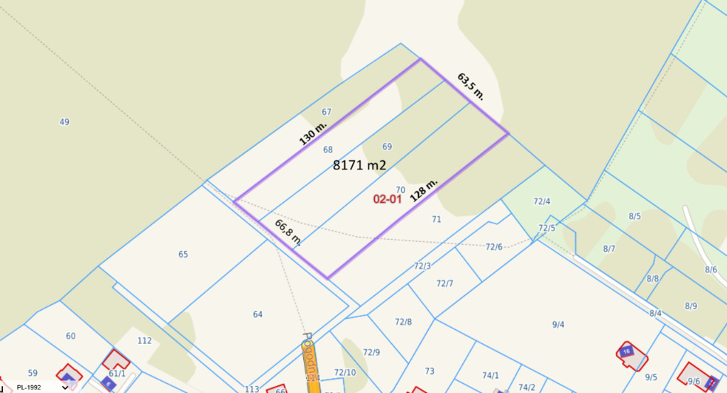 Dodatkowe informacje Działka sąsiaduje z terenem oznaczonym obecnie jako leśny (dz. 71), co wiąże się z koniecznością zachowania odległości zabudowy – jednocześnie złożony został wniosek o zmianę przeznaczenia na zabudowę mieszkaniową (plan ogólny).