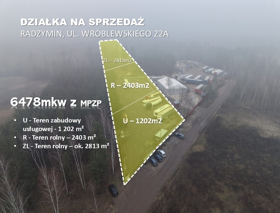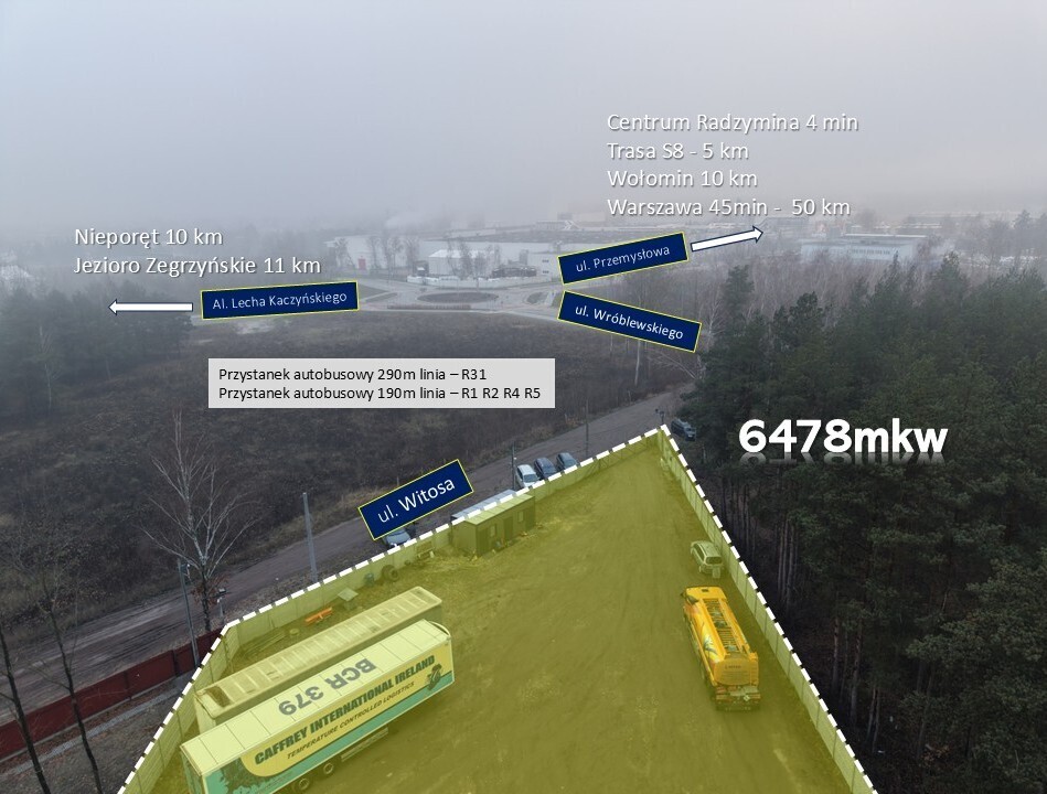 Na sprzedaż działka inwestycyjna w Radzyminie – ul. Wróblewskiego 22A, działka nr 34 (obręb 01-02) o powierzchni 6 478 m², zlokalizowana w rejonie przemysłowym miasta (okolice zakładów Coca-Cola). Nieruchomość jest ogrodzona betonowym murem i przygotowana do intensywnego użytkowania: posiada monitoring, alarm oraz oświetlenie. Obecnie teren funkcjonuje jako parking dla samochodów ciężarowych.