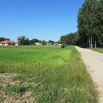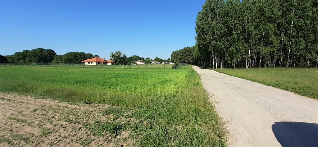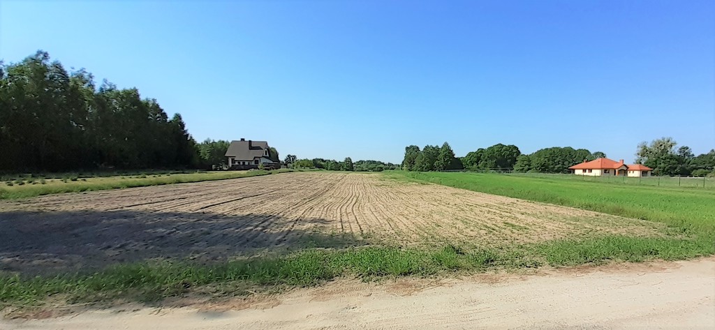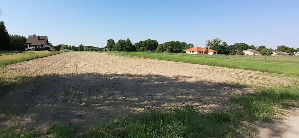 Działka przeznaczone pod zabudowę (bez miejscowego planu MPZP) z mediami przy granicy działki. Ukształtowanie terenu lekko nachylone, kształt działki zbliżony do prostokąta.
