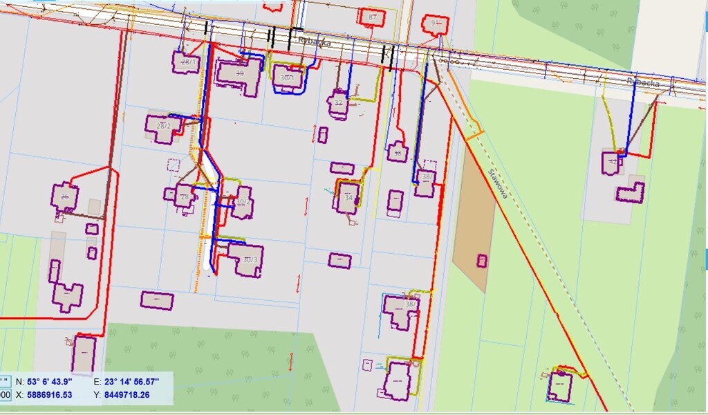 prąd, gaz, światłowód, natomiast sieć kanalizacyjna i wodna znajduję się w odległość ok. 50 czyli w ulicy Rybackiej.