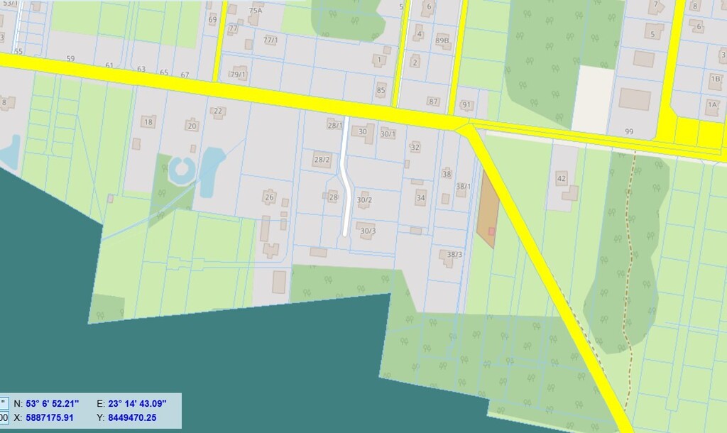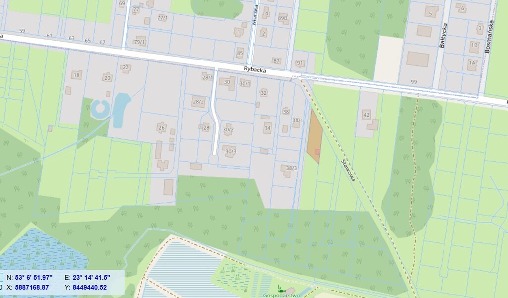 ok. 50 m od ulicy Rybackiej (asfalt), bezpośredni zjazd z ulicy Stawowej ( szutrowej). Wokół nowe domy w