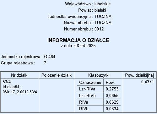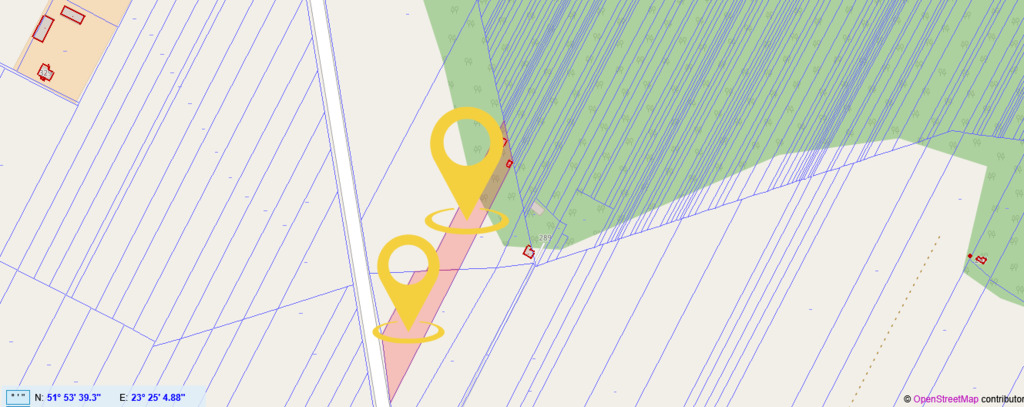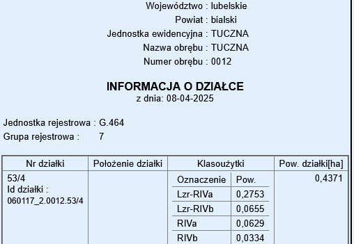 Działka nr 53/4 – powierzchnia: 4371 m²Działki znajdują się w spokojnej okolicy, w pobliżu terenów zielonych, co czyni je idealnym miejscem do zamieszkania lub pod inwestycję.