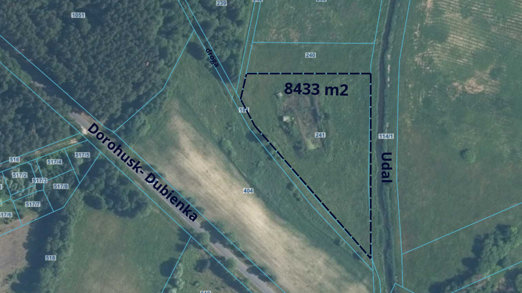 łąki (ŁIV i ŁV). Teren zróżnicowany, dobrze nasłoneczniony, dojazd drogą polną. Działka graniczy bezpośrednio z rzeką Udal, na jej terenie znajduje się staw i drewniany domek narzędziowy, liczne trzcinowiska. Obszar nie objęty MPZP.