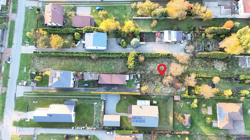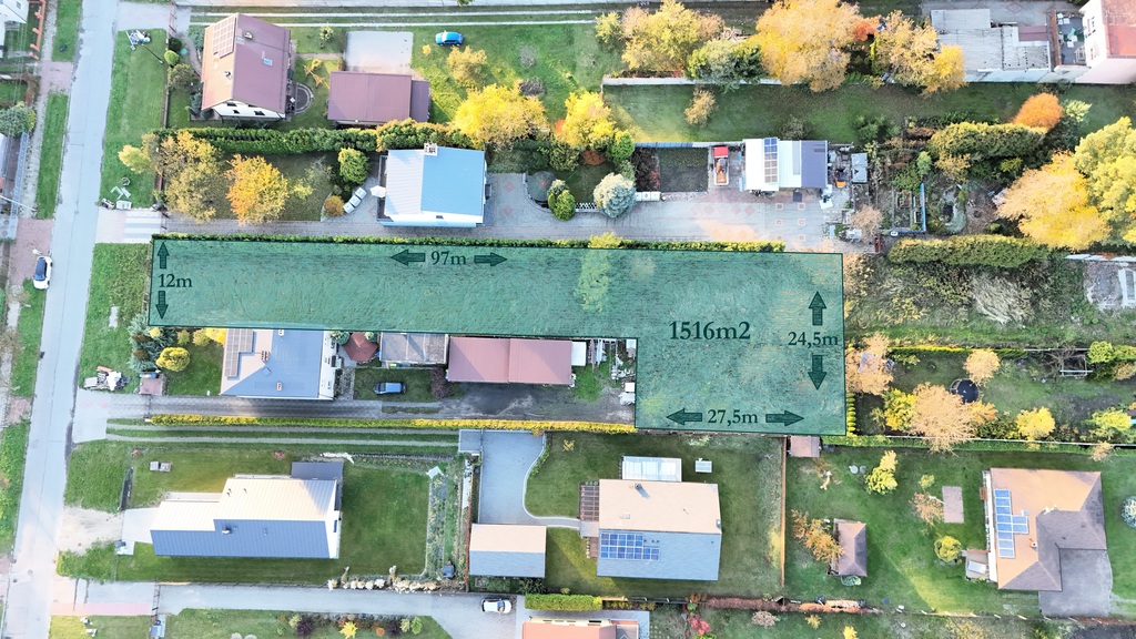 Działka o łącznej powierzchni 1516 m2 w kształcie litery L o wymiarach: 24,5mm x 27,5m + 12m x 69m