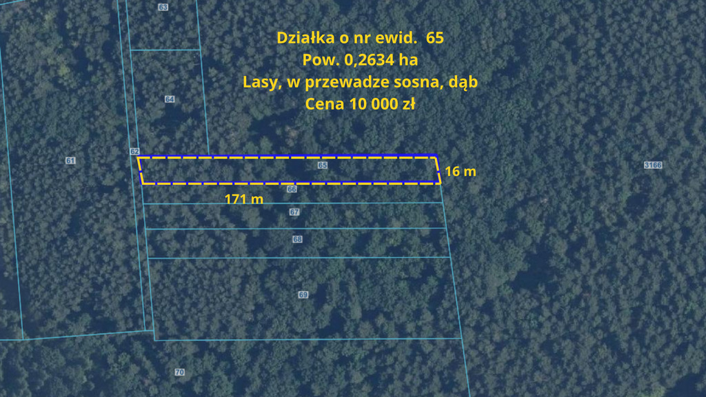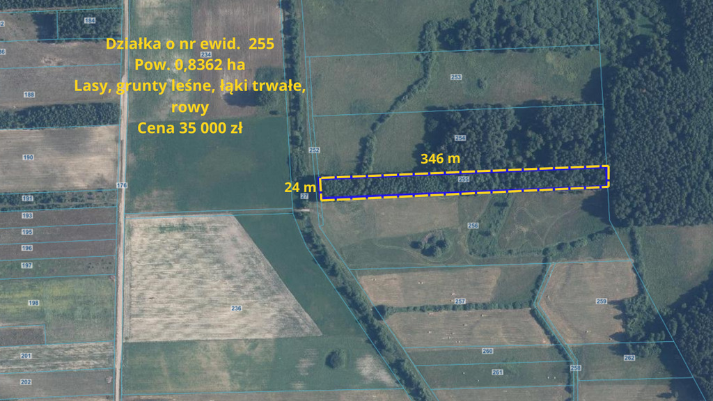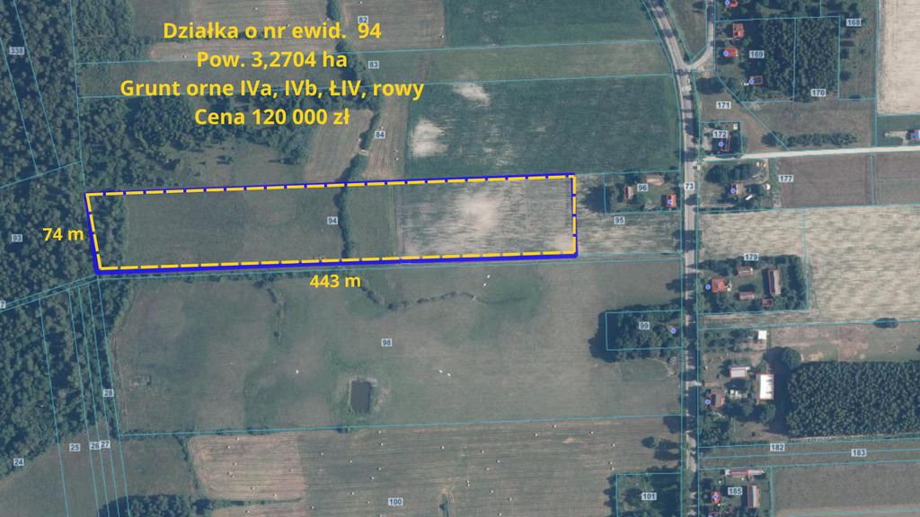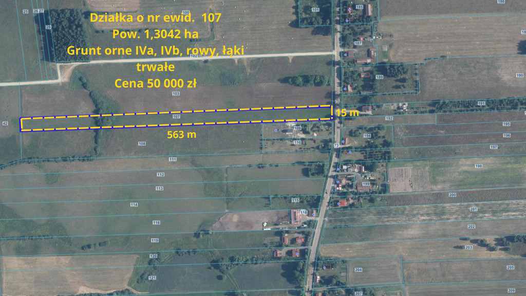 Teren płaski, dobrze nasłoneczniony, dojazd drogą polną. Preferowana sprzedaż w całości.