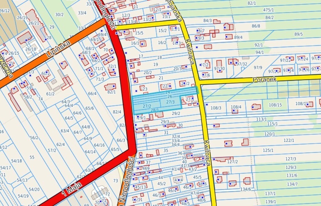 - numery działek: 24, 25, 26, 27/1, 27/2, 27/3, 28/1,