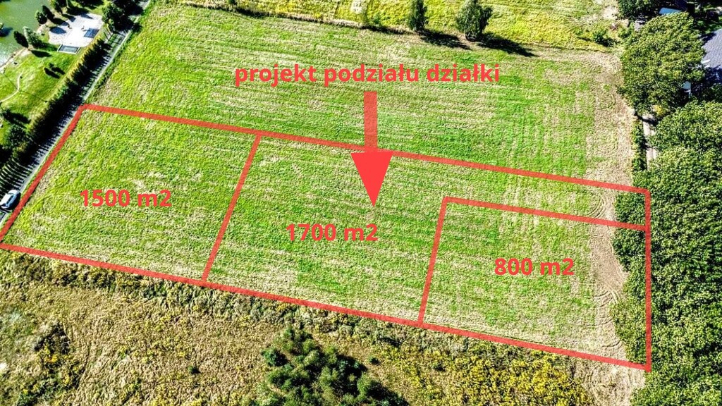 Możliwość podzielenia działki na trzy mniejsze ( projekt w posiadaniu) : 1700m2, 1500 m2 oraz 800 m2.
